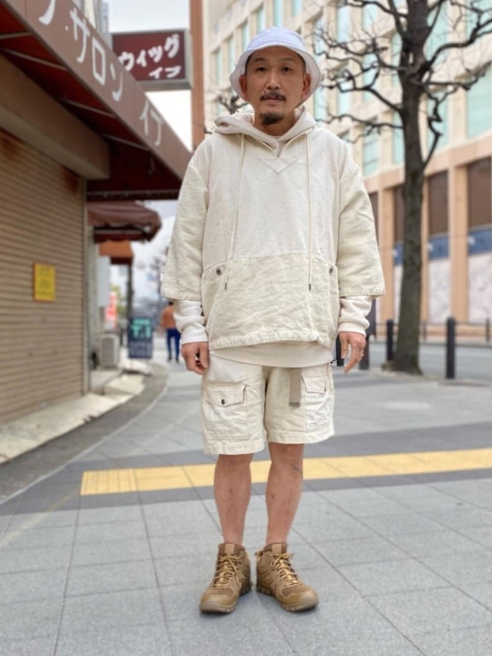 3種類の異素材同系色の素材を使用したメキシカンパーカーとアノラックをミックスした様なプルオーバージャケットと 同素材のワイドシルエットのショートパンツ。 しっかりした厚手のリネン素材ですので長く着れそうです。ゆったりした作りですので インナーに厚手のパーカーを着ても余裕です。