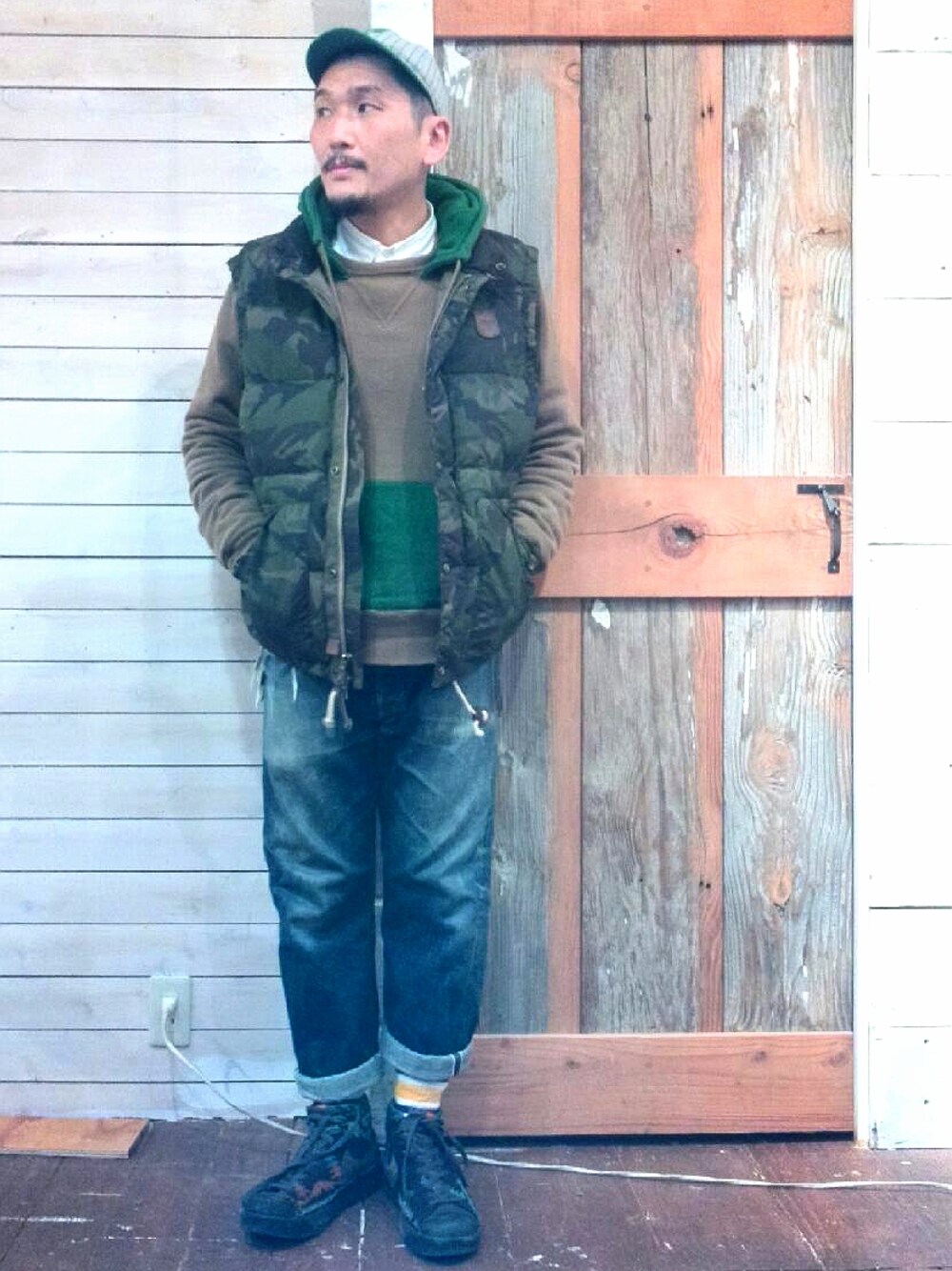 こんにちわ♪ まだ、店舗改装作業中にて、改装現場での撮影になります♪ あーだこーだやってると粉塵が舞ってるのでこんな 感じの画質になってしまいました(*≧∀≦*) 今回のコーデはカモフラ柄のベストに合わせて、インナーのパーカーをカーキベースにグリーンの切り替えのものを選びました。 キャップもグリーンベースで☺ スニーカーは柄物繋がりで、PENDLETON とコラボのNIKE blazer で合わせました♪ 作業が全然終わらず、今日も返信や皆様のところに遊びに行くのが遅くなってしまいますが御了承下さい。 昨日も、皆様の暖かいコメントやSAVE のお陰様で、作業の疲れが癒えました✌ こんな感じですが宜しくお願い致します。