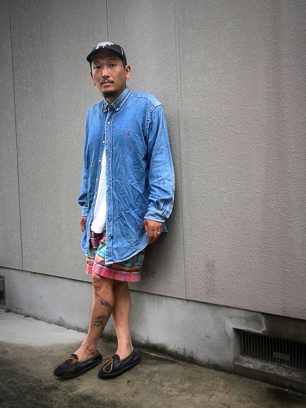 こんにちわ♪♪ 雨ツラいですね💦 今回はキャップ、モカシンをネイビー系で合わせ、ボトムはチェック柄の海パンで合わせました。 インナーは無難に白で合わせました。 こんな感じですが宜しくお願い致します♪♪