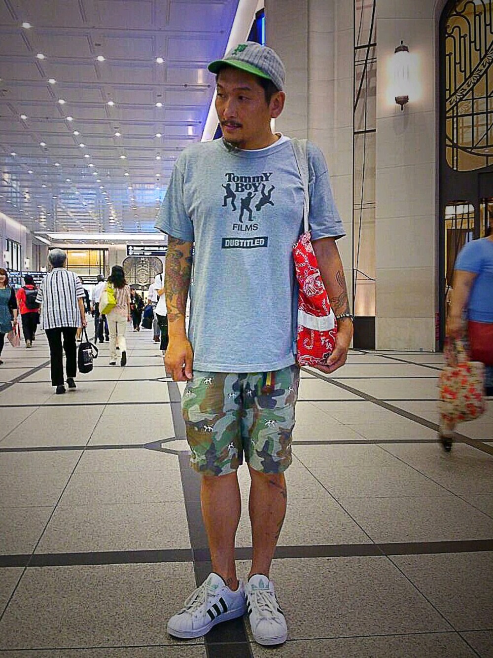 こんにちわ♪♪ キャップのグレー×グリーンの配色に合わせてコーデしてみました。 キャップのボディーの部分のグレーに合わせてトップスのグレーにしようと思い、 オールドスクール好きな人には懐かしいTOMMY BOY のTシャツで♪♪ ツバの部分&ロゴのグリーンに合わせて迷彩のグリーン、靴の3本ラインのグリーンを合わせました。 ついでにインナーの白Tと靴の白も合わせてます。 バッグの赤は差しで。 こんな感じですが宜しくお願い致します♪♪