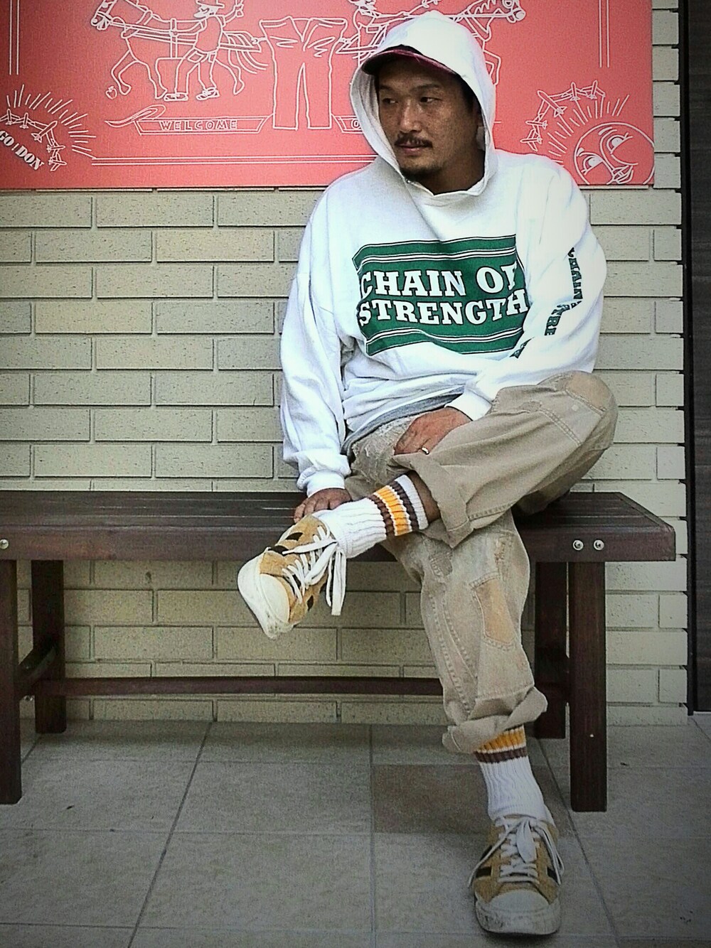 こんにちわ♪♪ 80年代カルフォルニアのハードコアバンド、CHAIN OF STRENGTH のパーカー、十代の頃ハードコアにハマってた頃よく着てました。懐かしい💦 久し振りに着ると、ボディの素材感、シルエット、毛玉の出来やすい感じ、どれを取ってもトレンドとは反してますが、なんか若い頃を思い出してテンション上がりますね(笑) お店のオープンまであと少し。 ラストスパート頑張ります♪♪ 看板、ポスター、名刺、フライヤーまで WEAR で人気のいつも素敵な絵を描かれてる、むちむち729さんにデザインして頂きました。 むちむちさん、ホントありがとうございます♪♪ 9月5日オープンするお店。 「GO!DON」 兵庫県伊丹市中央1-4-12 グラディオ伊丹101 阪急伊丹駅下車 徒歩2分 JR伊丹駅下車 徒歩15分 国内外のブランドとUSEDでの商品構成でMENS とKIDS の商品を取り揃えております。皆様、是非御来店お待ちしております♪♪