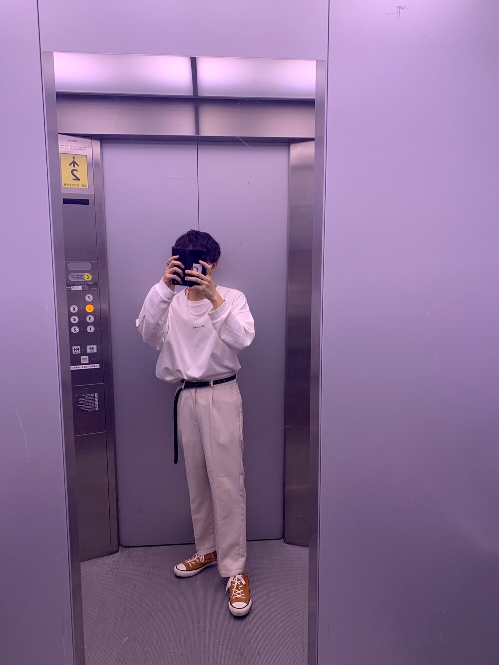 オールホワイトコーデで差し色でオレンジ🍊 ロンTはオーバーサイズでタックインしてスタイル良く! やっと秋になってきたなぁー🌰