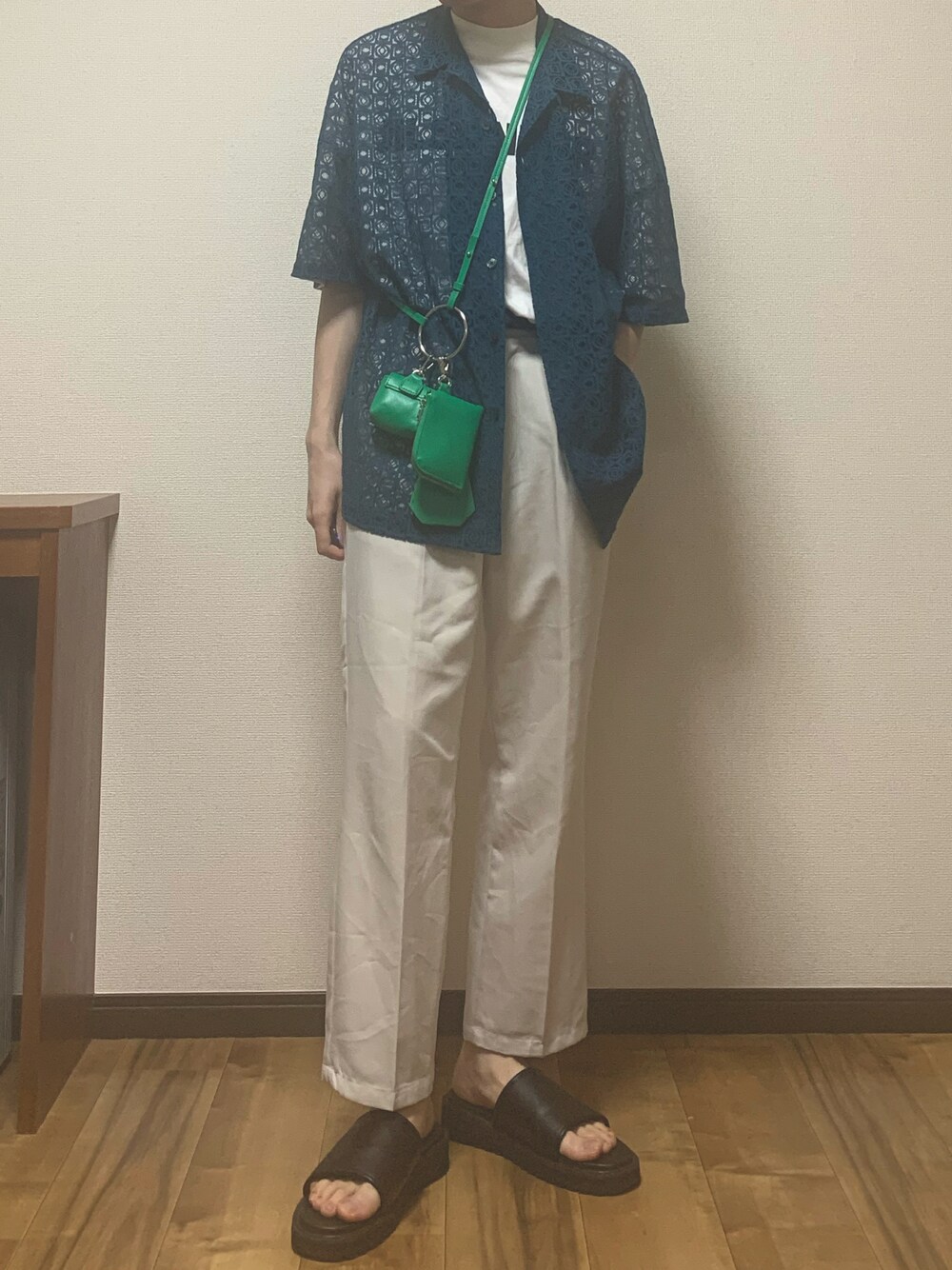 トレンドのシアーシャツをつかってコーデ組んでみました! ホワイトのストレートスラックスで爽やかに! グリーン✖︎ホワイトで涼しげな夏のコーデに! このシアーシャツめっちゃお気に入りです! このコーデがいいと思った方はいいねやお気に入りよろしくお願いします🤲