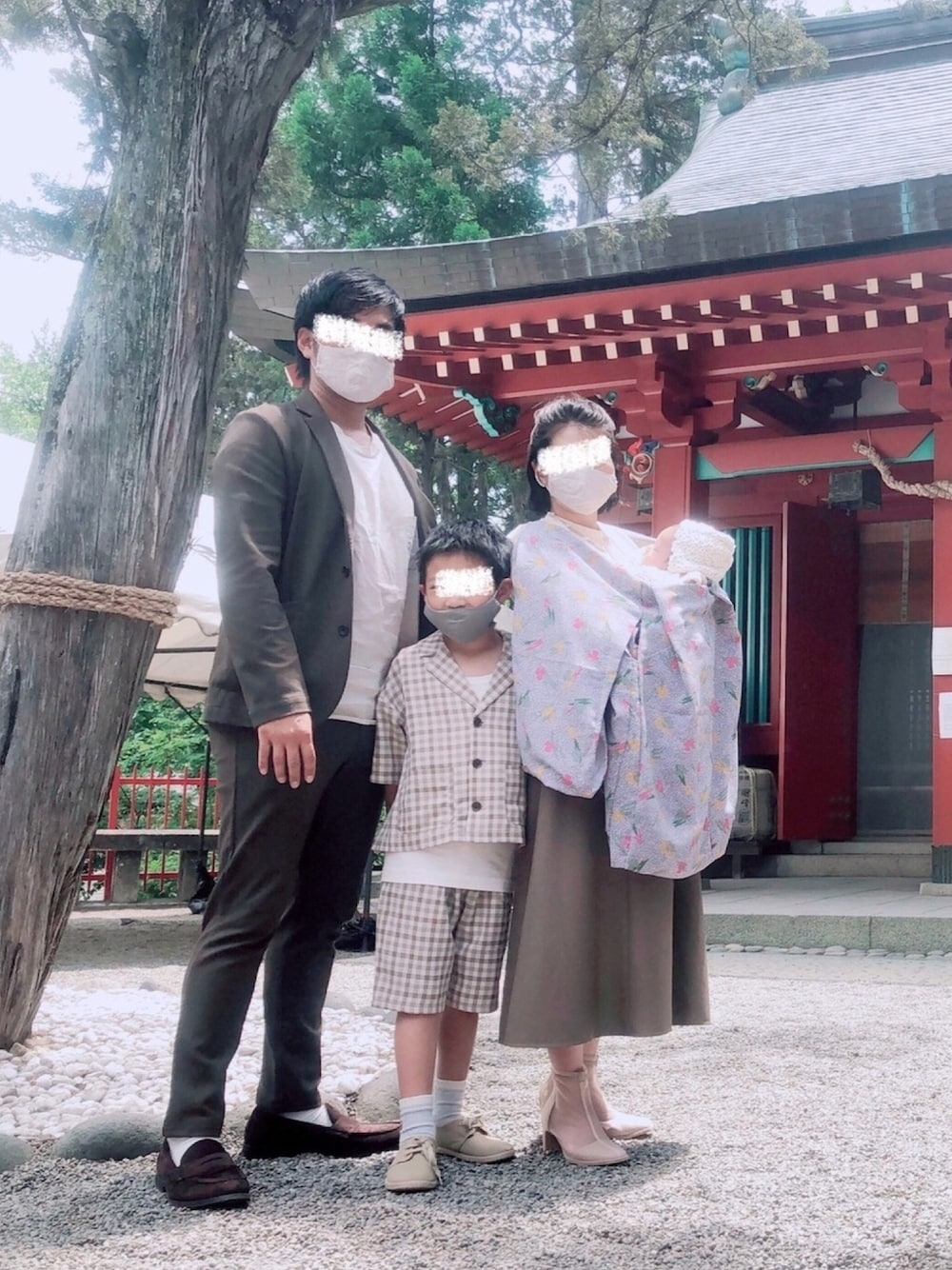 家族でお宮参り。 晴れてよかった! ベージュ•茶色で統一してリンクコーデ