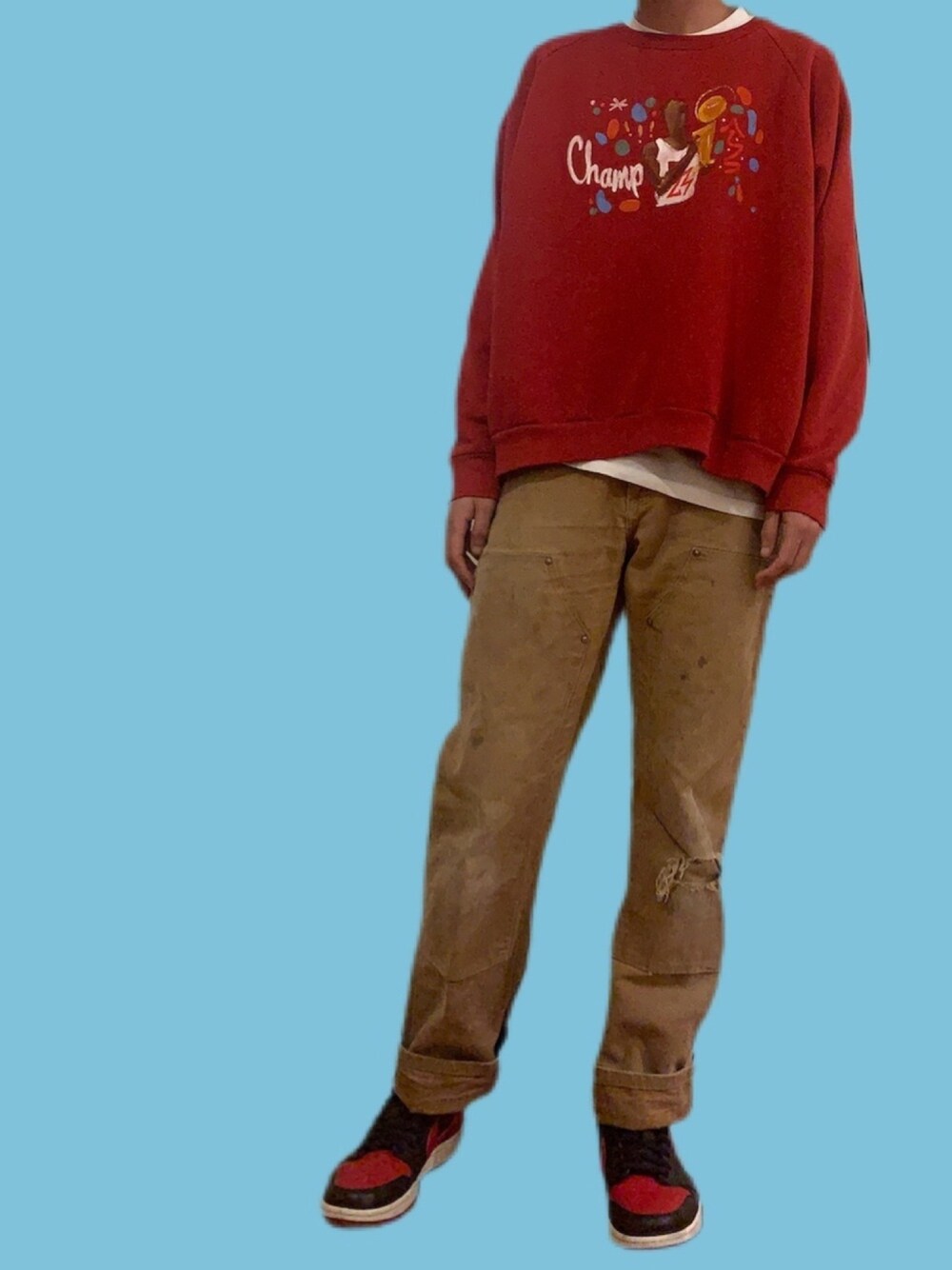 Sweatshirt has an acrylic portrait of Michael Jordan after winning the 1996 NBA Finals by my friend Renz Balagatas on it. Sneakers are 2015 Air Jordan 1 Lows in the Bred colorway.
