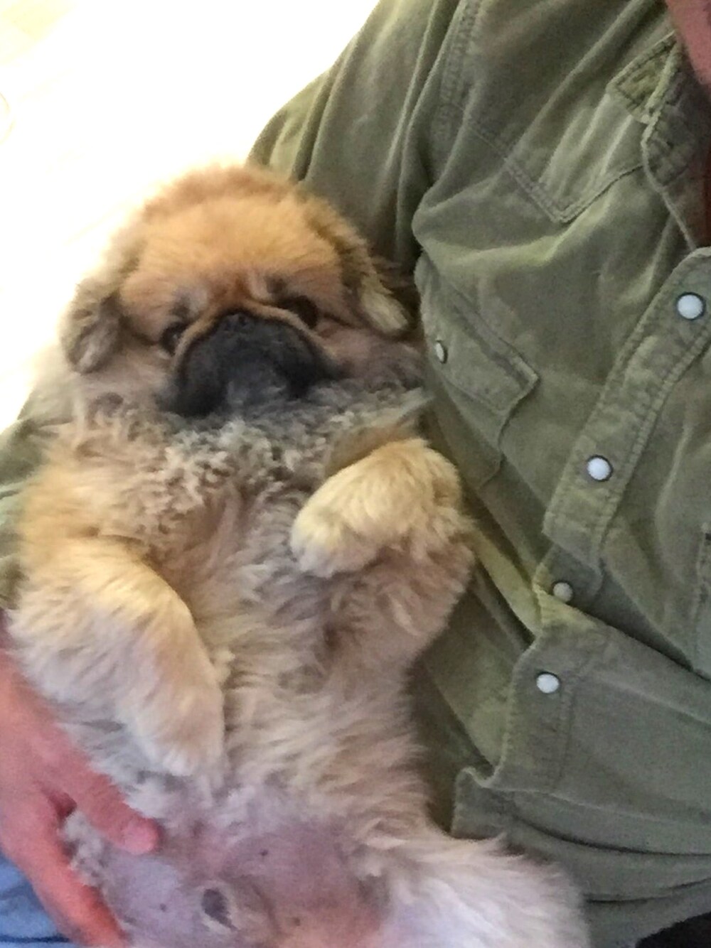 カーキのコーデュロイのシャツに ベージュのモフモフの犬をコーディネート。