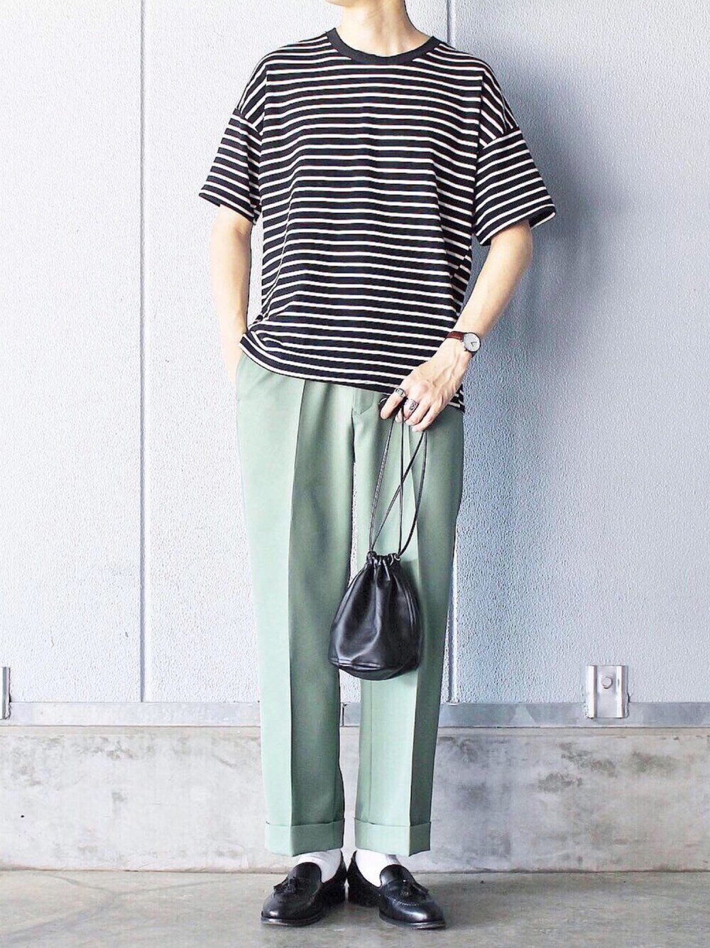 Instagram → ryu__wear__ (_2つずつです) Instagramでは、wearでは載せてないコーデなども載せてますので、 是非遊びに来てください✊🏻 シンプルなボーダーコーデです☑️ カラーパンツはモノトーンのアイテムと合わせて主役に🦖 トップスをタックインしてもかっこいいです◎ レザーの巾着とローファーの相性良すぎてめちゃめちゃしてます🤦🏻♂️ ガッツリキレイめによせてスタイリングするのもたまには◎