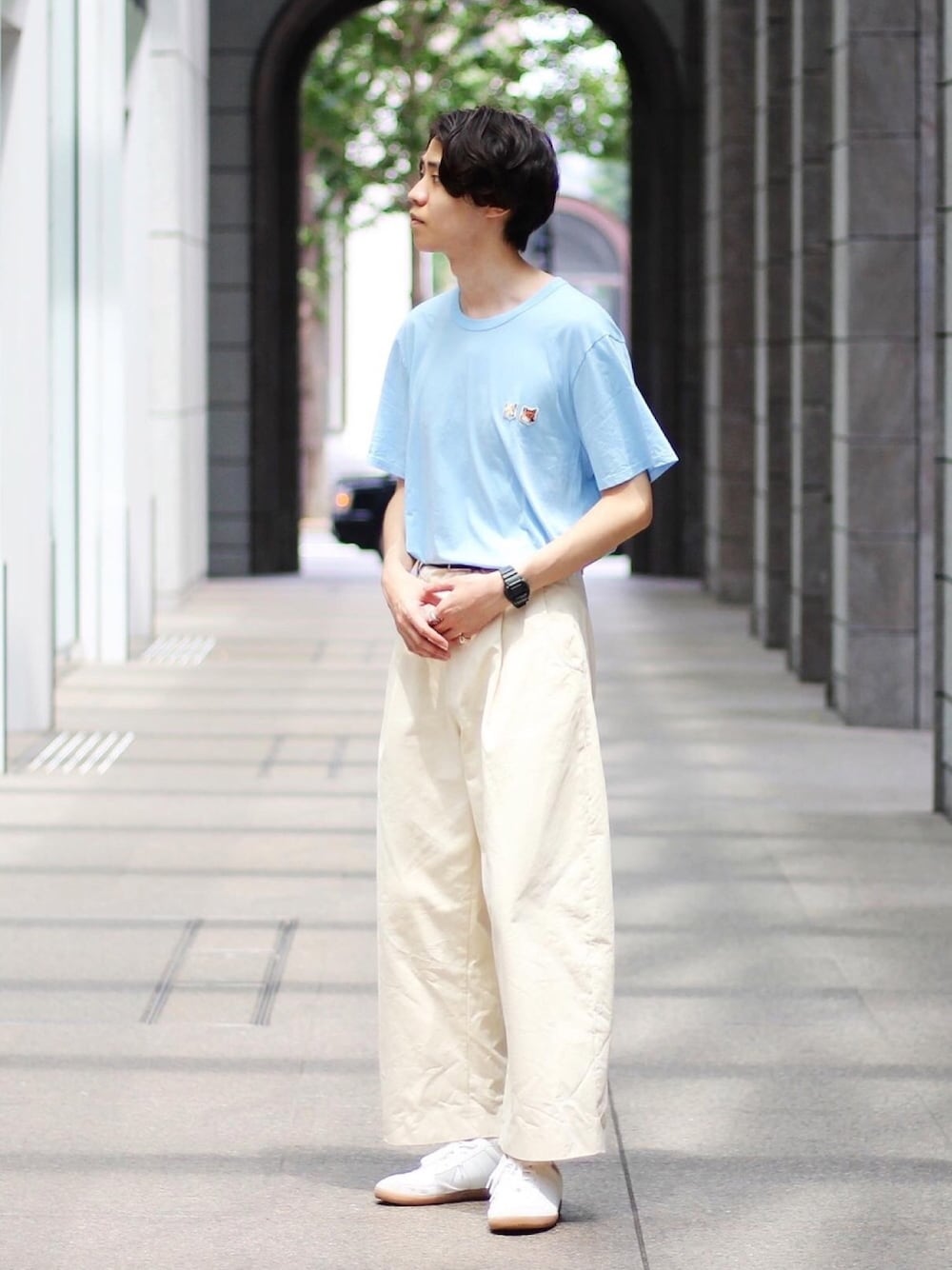 淡い色味のタックインスタイル🦊 ベルトと時計で色を引き締めました◎