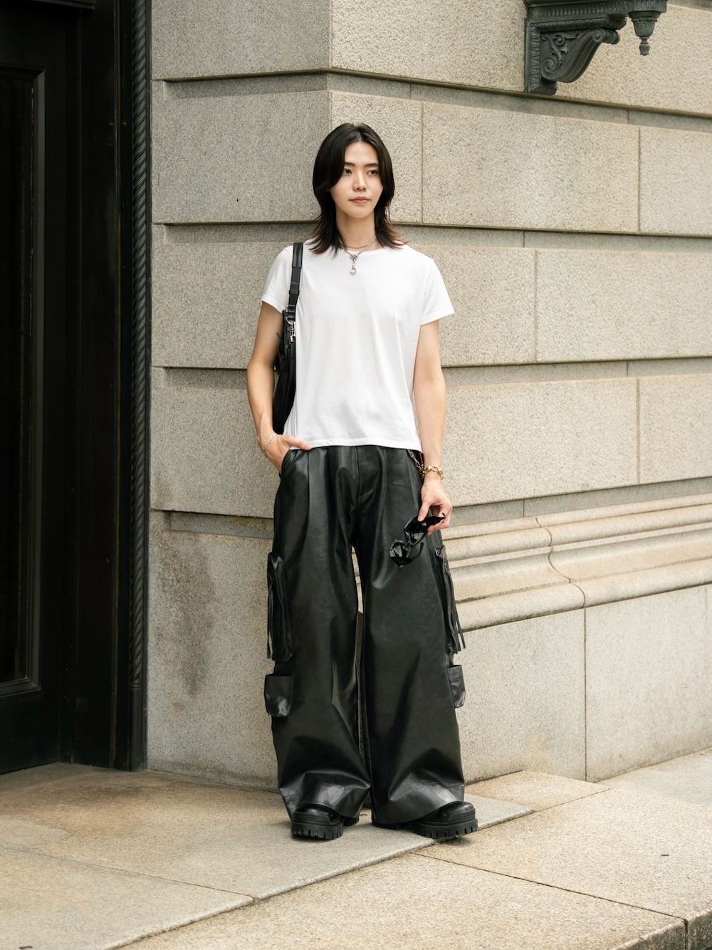 Ryuのカーゴパンツ「Vintage like military cargo pants ( fake leather )/ヴィンテージライクミリタリーカーゴパンツ(合成皮革)」を使ったコーディネート