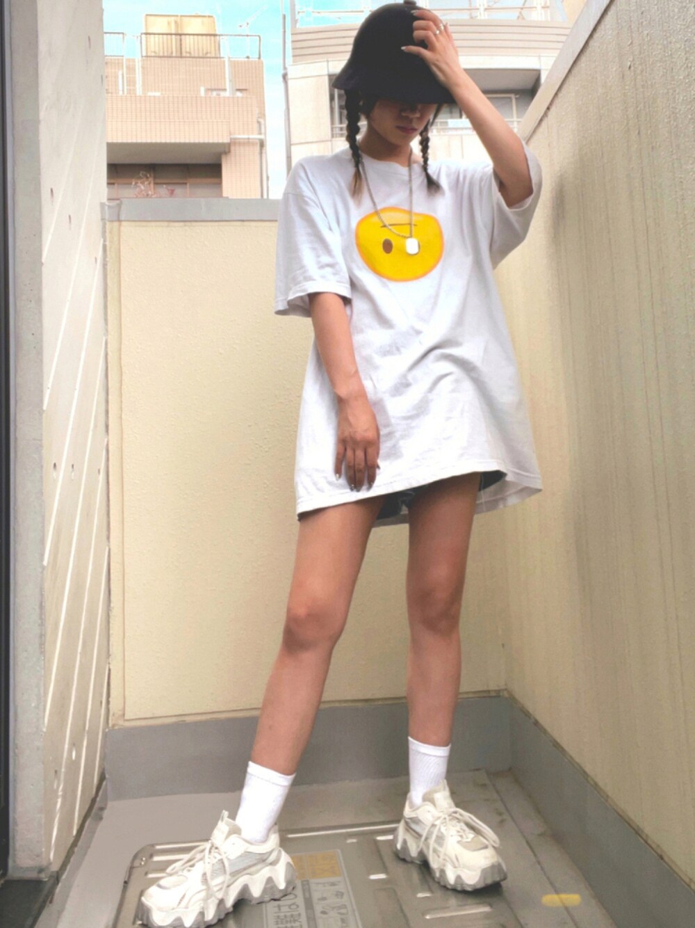 仕事コーデ instagram @orcn_1021 ハワイで買ったANTI SOCIAL SOCIAL CLUBの 絵文字Tシャツ🙃 スニーカーは大きめシルエットです👟 #白も着るよTシャツだけど。