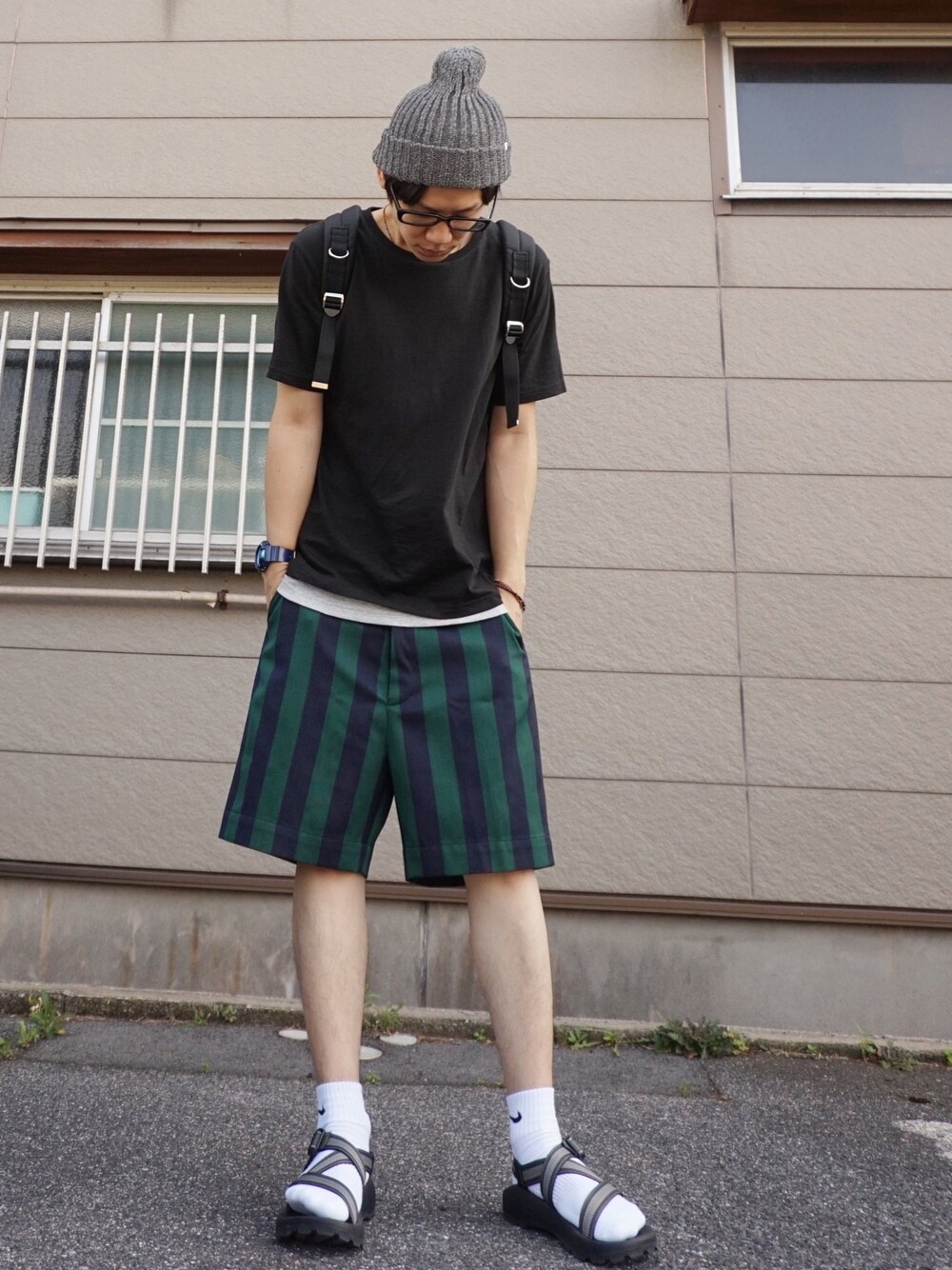 最近黒が好きです。 そろそろサンダルも終わりですね。 パンツは大きめサイズを腰履きしてます。