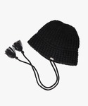 お気に入りのビーニー風ニットハット! ビーニーとバケットが混ざったようなシルエットでざっくり編みな生地感もgoodです! 顎ヒモは垂らしても中に入れ込んでもOKです! 伸縮性のある生地なのでヘッドサイズ59cmでもゆったりなサイズ感です。