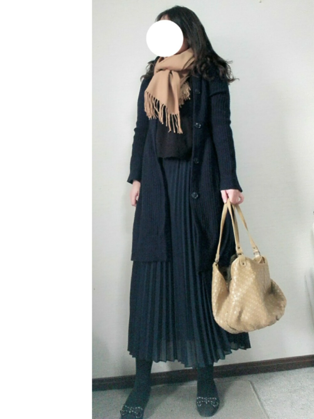 ネイビー×ブラック×キャメル プリーツスカートは、ペラペラなのでちゃーんとペチコートもはいてます😊 ストールは、 タイムセールでお安くget❤