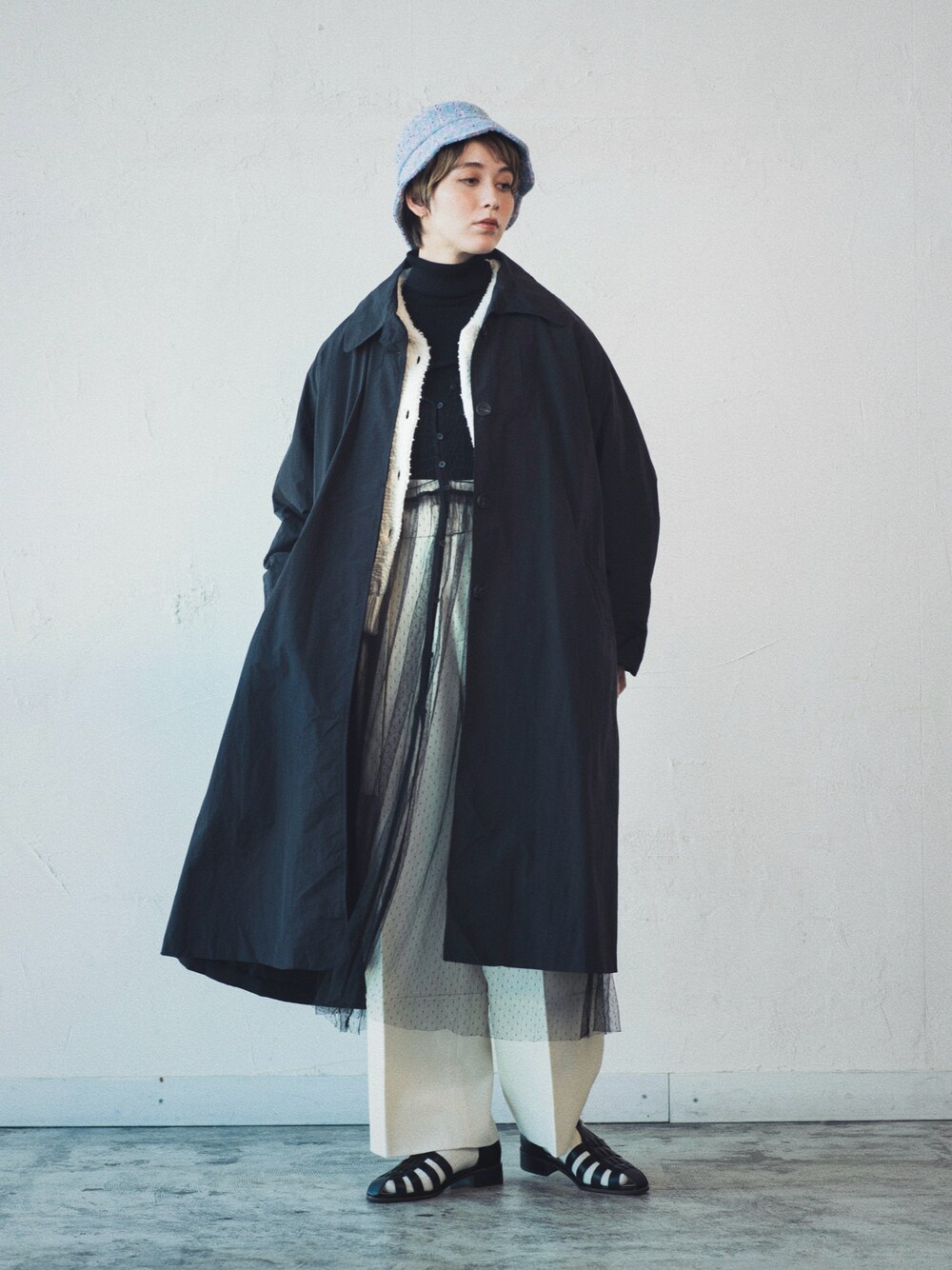 ゆったりステンカラーコートをばっさり羽織って、帽子は浅めの小ぶりのハットでバランス良く。