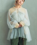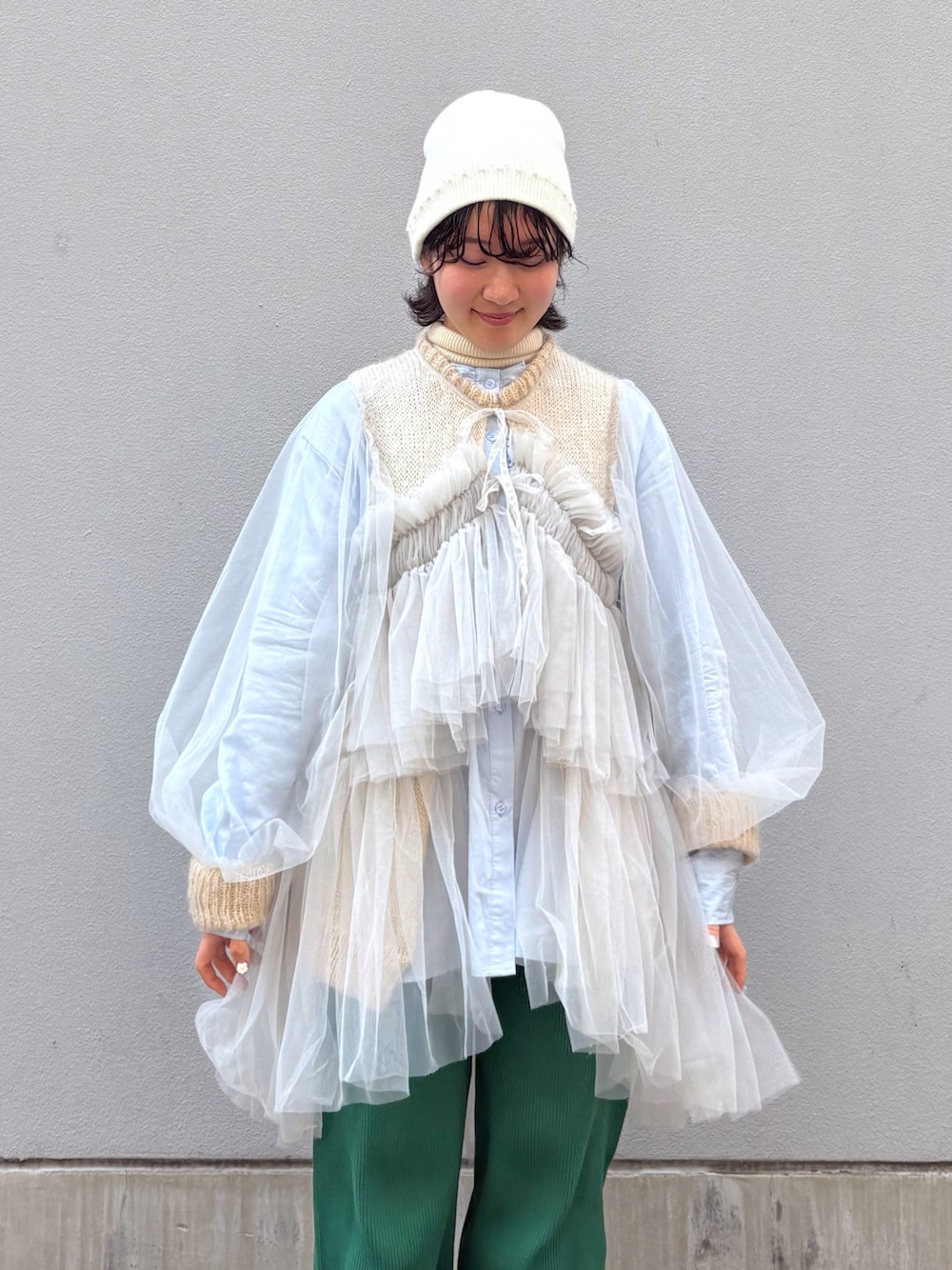 フェミニンなチュールニットカーディガンにニットビーニーを合わせてカジュアルダウン◎