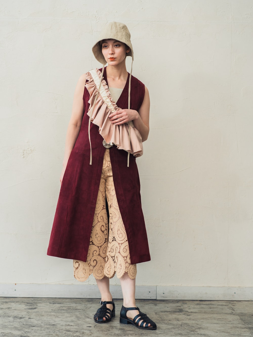 ピンクベージュなコーディネート 《BAGに見えないフリルBAGを洋服の一部のように着るコーデシリーズ》 こう見えてフリルBAGの中は、お財布、スマホ、ポーチが入ってます◎ ✔︎SUEDE LONG GILET ✔︎self-portrait - paisley race pants by MILLI VINTAGE ※お店にお問い合わせください