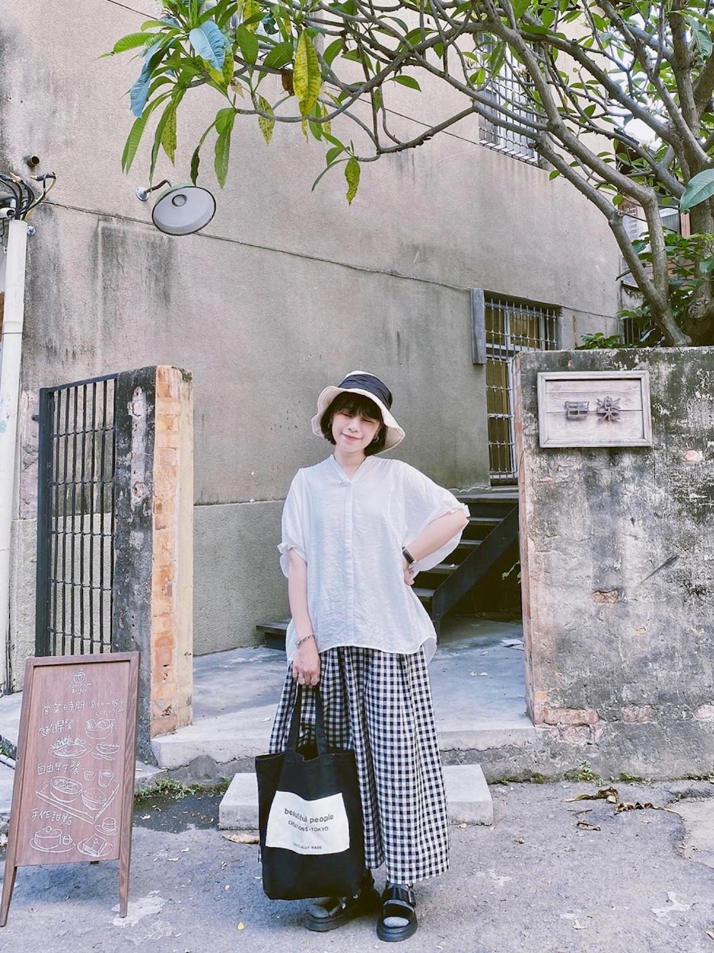 白シャツ+カンカン帽 定番的コーデ