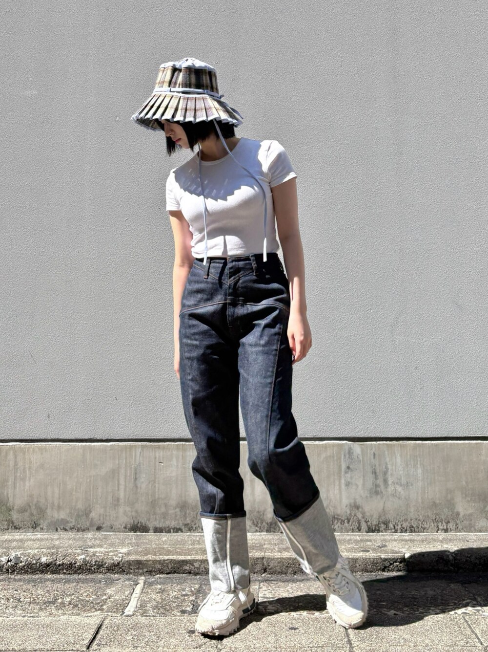 白Tシャツ×デニムパンツに相性抜群なアイスブルートリミングのローナマーレイ🕊️🫐🩵 UPF50+なので夏フェスや海にもおすすめです◎ 頭囲55cmでLサイズをゆとりをもって被っています。
