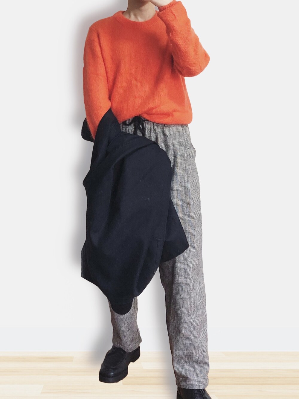 個性を出すには、色味と組み合わせ。 ・ 明るいオレンジにチェックパンツでクラシカルに。 コートを羽織ればより、大人っぽくなります。