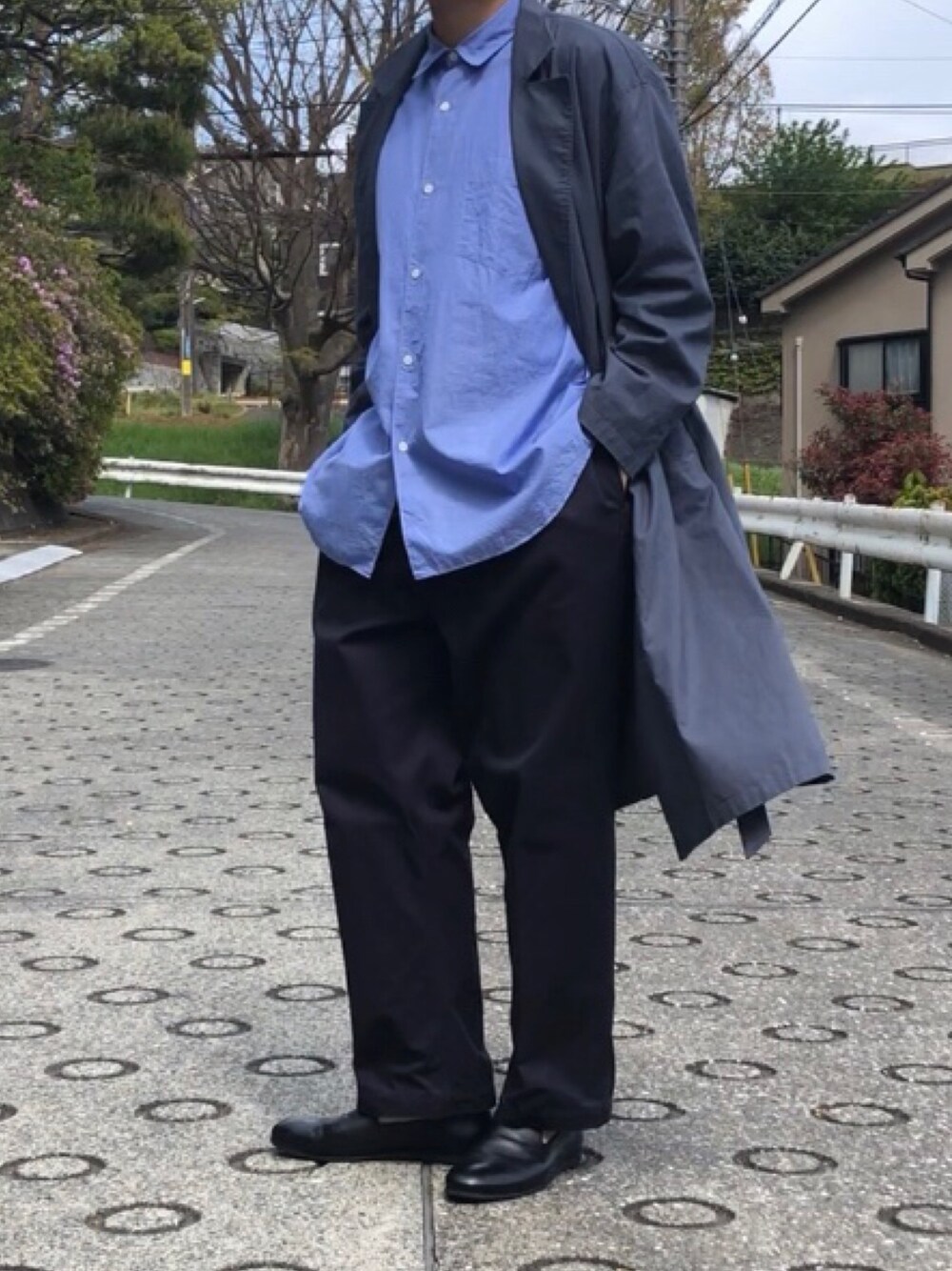 全身ブルーで統一しました。 _ アウターはレディースの3XLのものになります。ボタンが逆なので、外して結ぶだけのものにしました。 _ 色を統一すると比較的楽にコーデが出来ると思います。