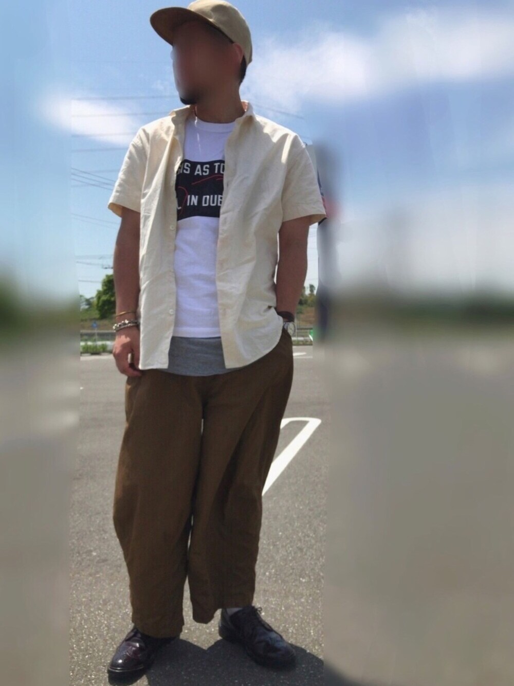 sacai × ローレンスワイナーのアートワークプリントTシャツ、一目惚れで昨年12月に購入しましたが、ようやく着ることができる季節になりました。 帽子:エンダースキーマ シャツ:ブルーナボイン Tシャツ:サカイ タンクトップ:アンユーズド パンツ:ニードルス シューズ:オールデン ブレスレット:ブルーナボイン