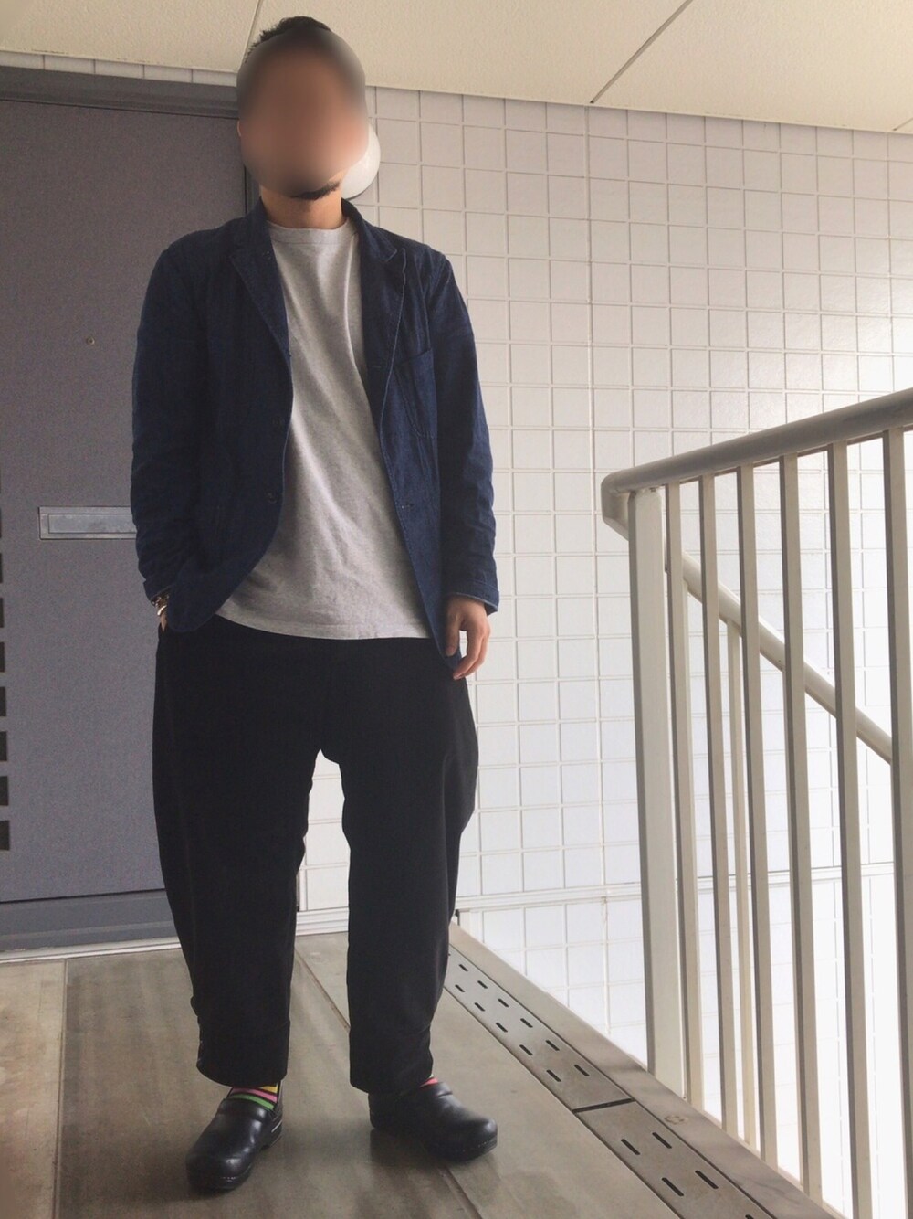 ジャケット:エンジニアードガーメンツ Tシャツ:ユニクロ パンツ:エムズブラック ソックス:ユニクロ シューズ:ダンスコ
