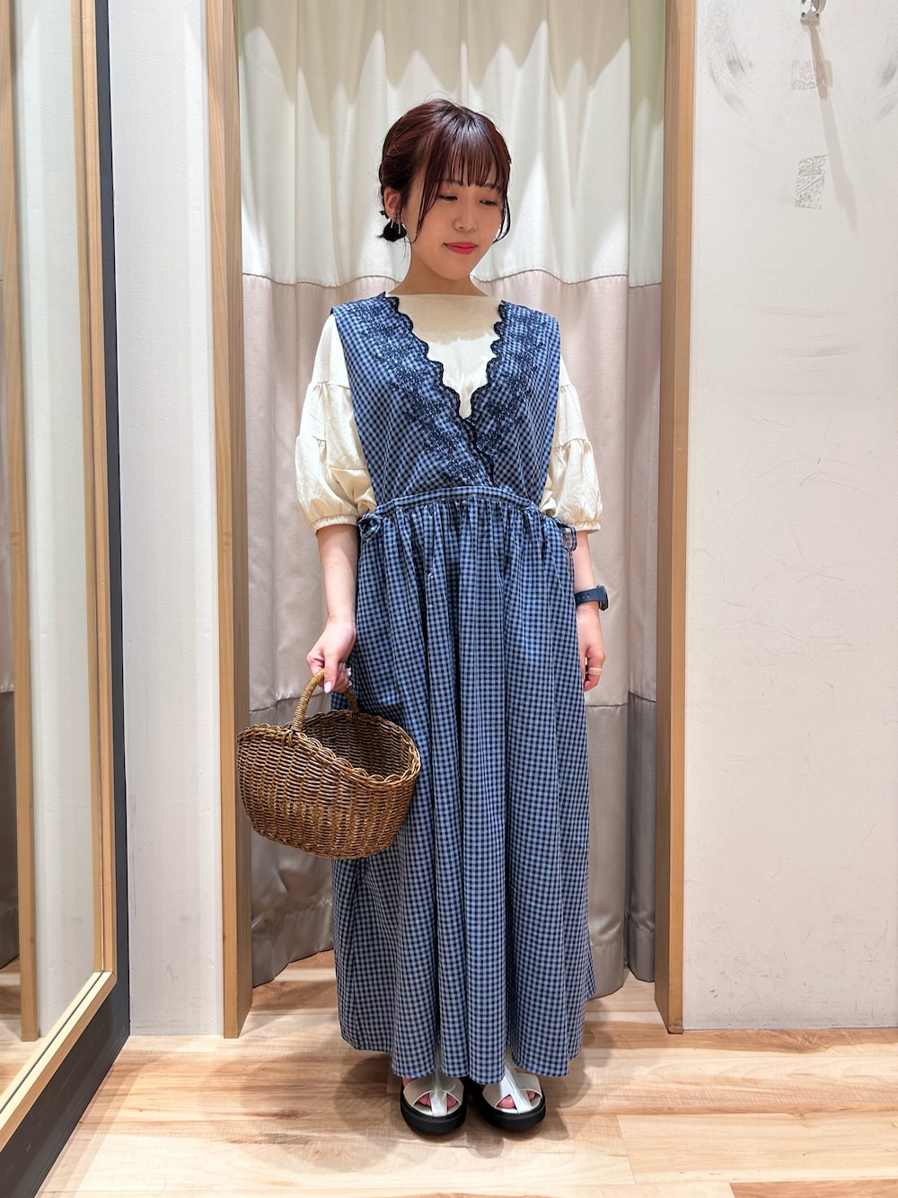 おり(151cm)のワンピース「【Sサイズ WEB限定】綿麻スカラップノースリーブワンピース」を使ったコーディネート