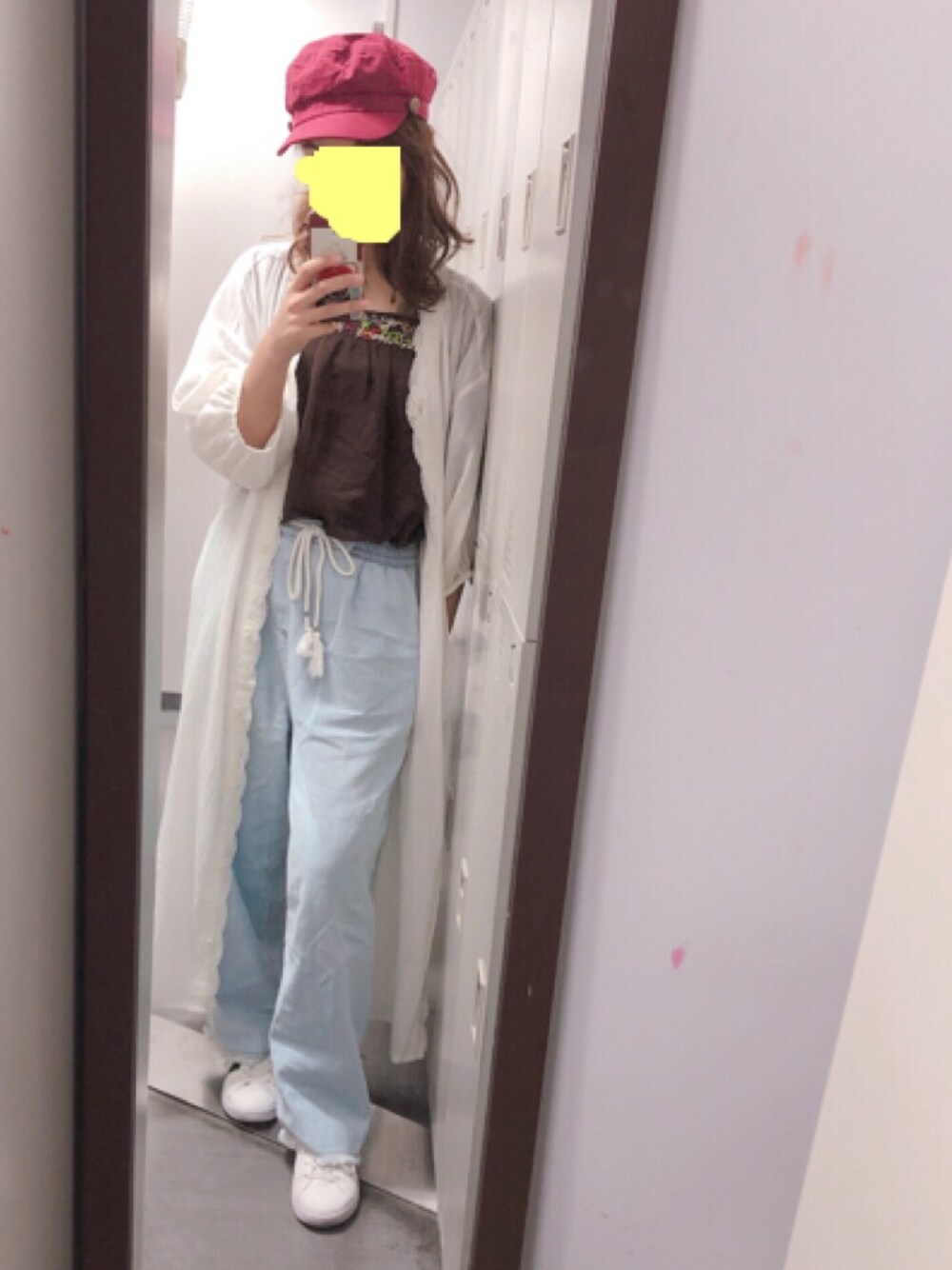 帽子のレッドをポイントに。 どこで買ったか忘れたブラウス。 でもお気に入り◎