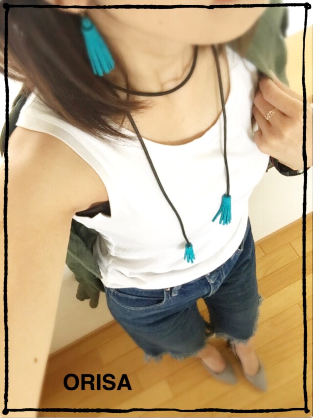 タンクトップだいすきだ~~~。 着れる季節になってうれしい(ღ˘⌣˘ღ) 夏っぽくターコイズブルーアクセ デニムガウチョ×フリンジパンプス