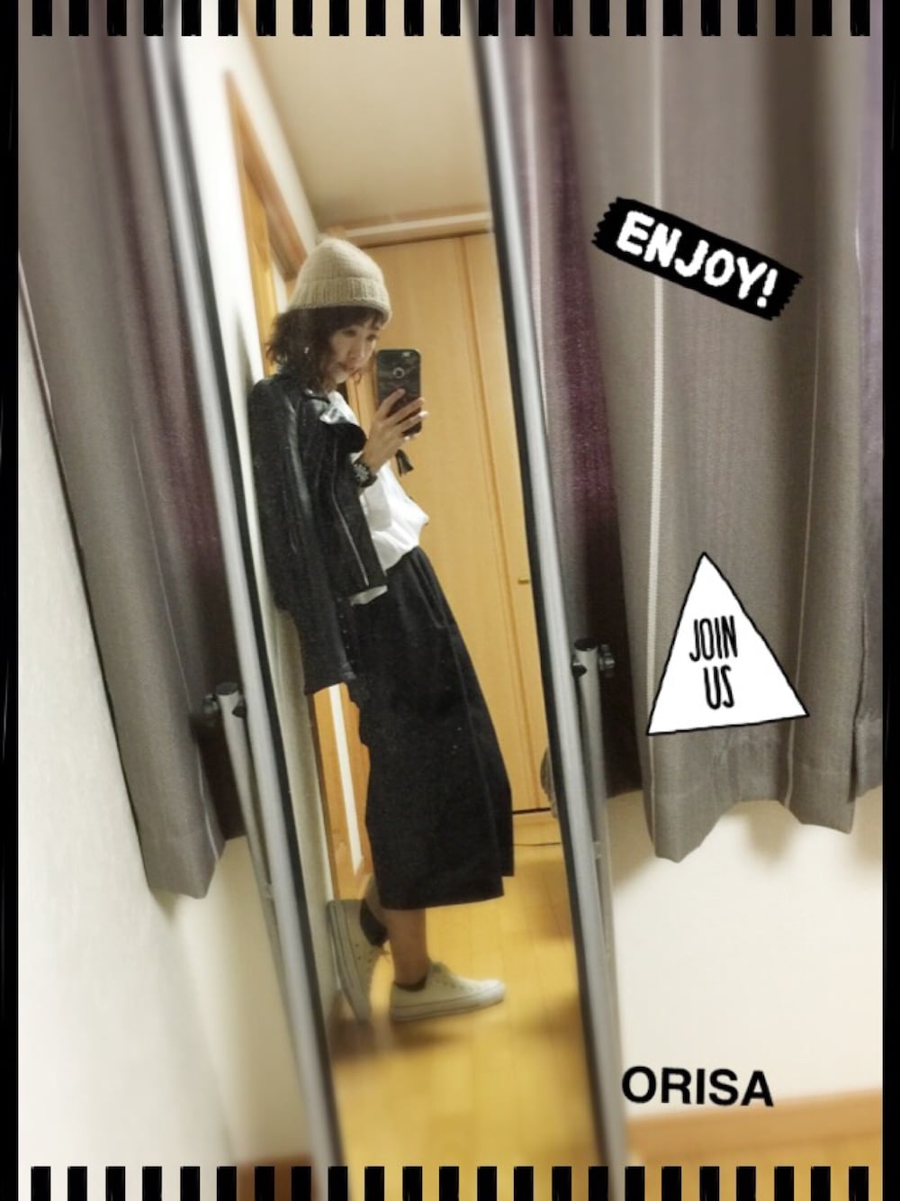ライダースヾ(o´∀`o)ノ だいすき(*´˘`*)♡ 今日はガウチョと・・・ ベージュのニット帽でやわらかさを出したよ。 ライダースの季節バンザイ(*」゚∀゚)」