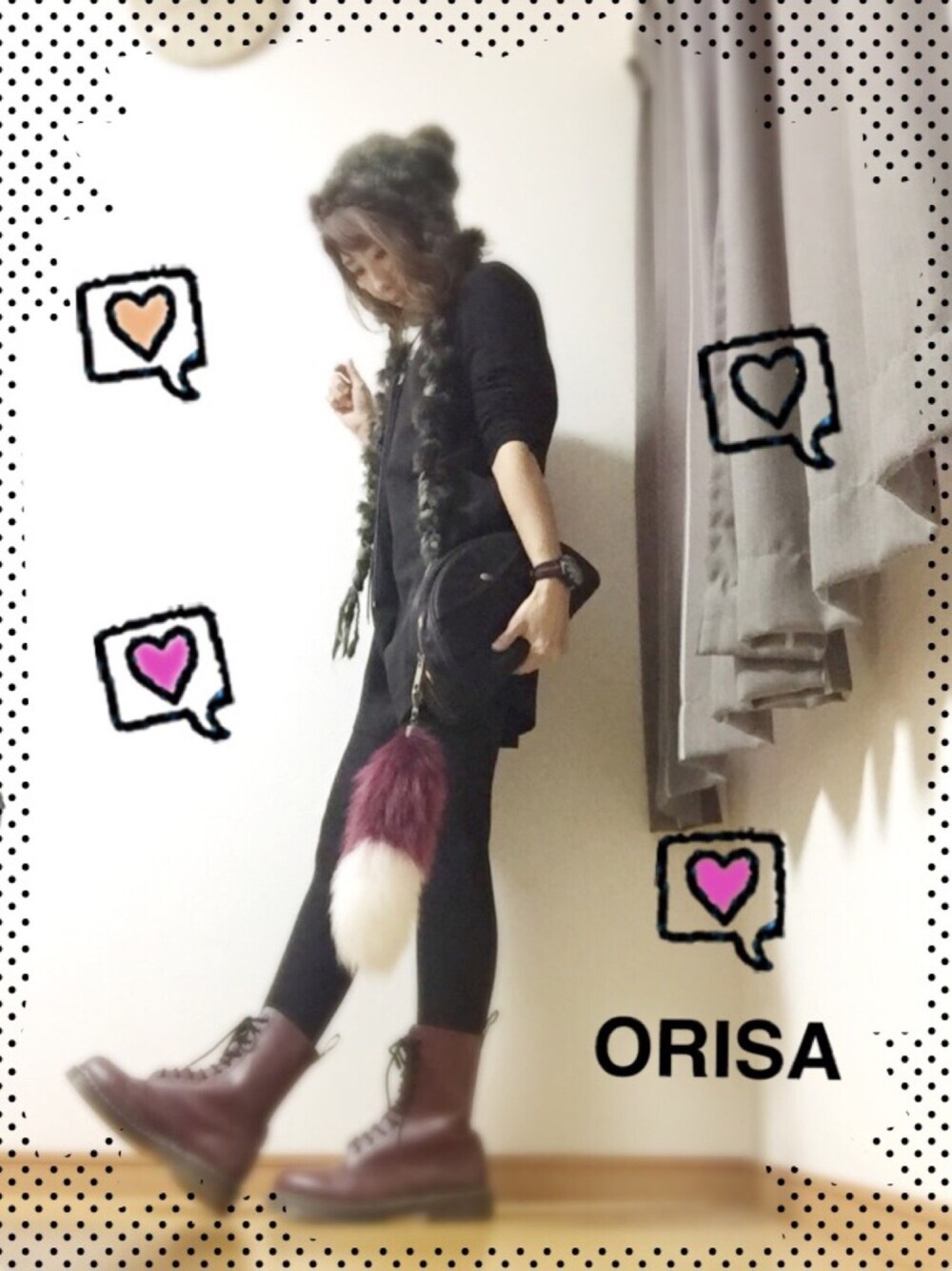 こんにちわ。 また一週間始まったね。 がんばろう~~~。今日はこんなコーデです。 帽子→CA4LA ミミがなが~~~い。 ロンパースをマーチンと合わせたよ。 マーチンのチェリーレッドを主役にあとはブラックで・・・