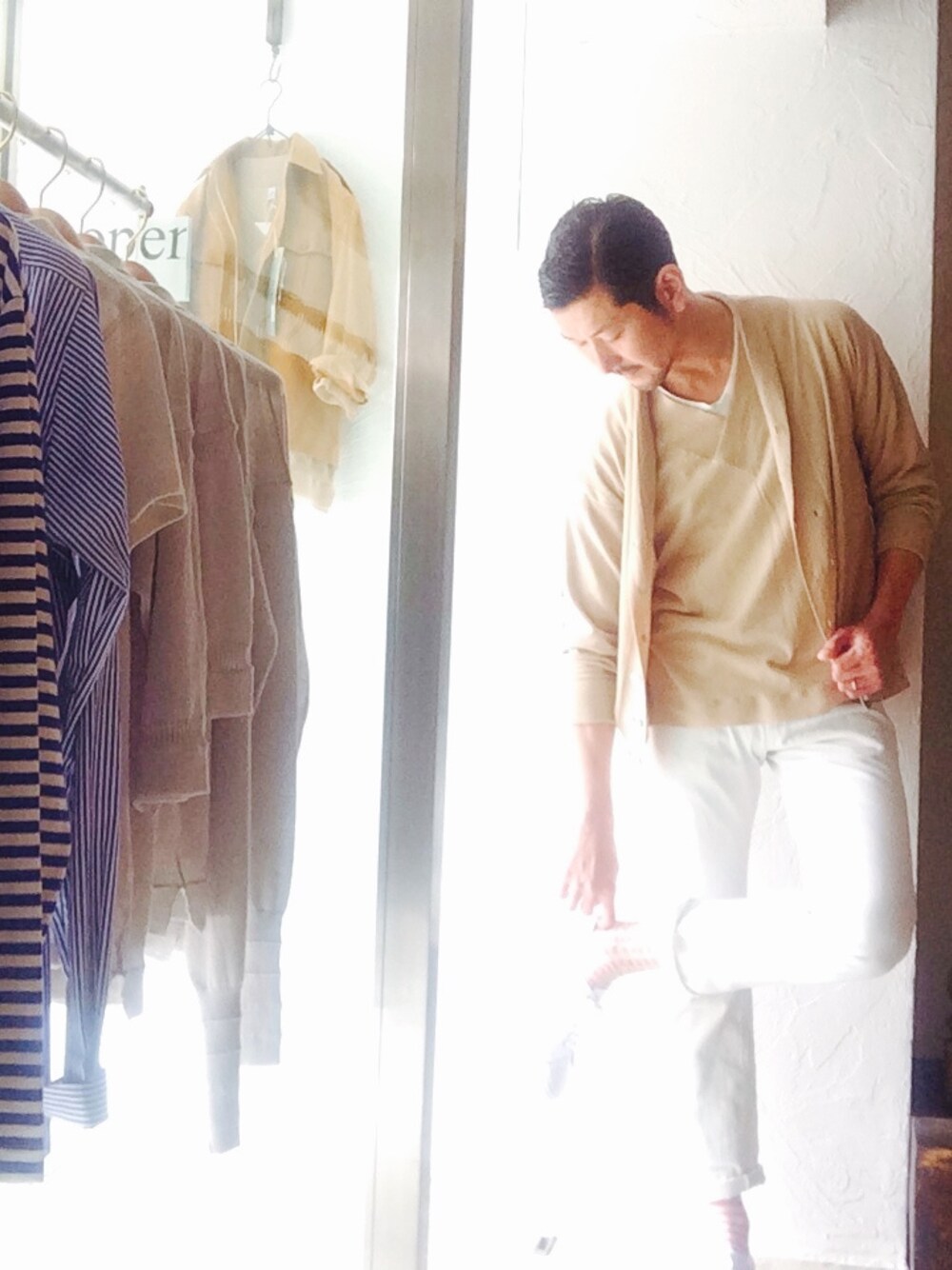 orloのニット/セーター「cleaveland Ramie × Cotton Half-sleeved V-knit」を使ったコーディネート