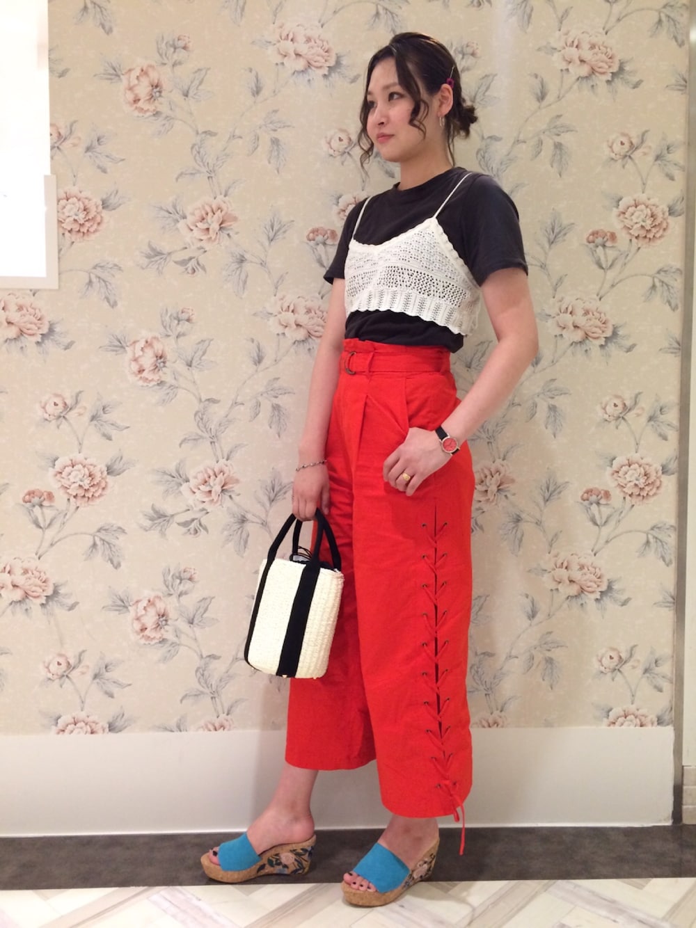 夏らしく明るいビタミンカラーコーデに仕上げました! パンツのオレンジに、ブルーの刺繍サンダルを合わせた上級者コーデに! ヒールの刺繍が他にはないデザインでおすすめです!