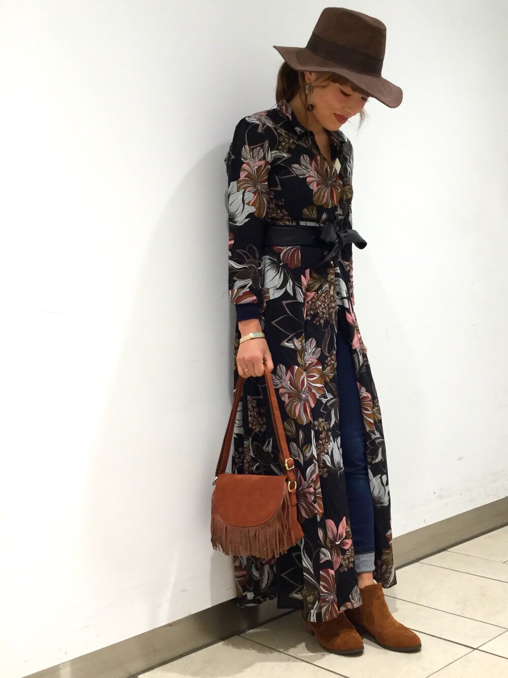 大胆な花柄のマキシワンピース✖︎キャメルの小物でボヘミアンを意識しました!