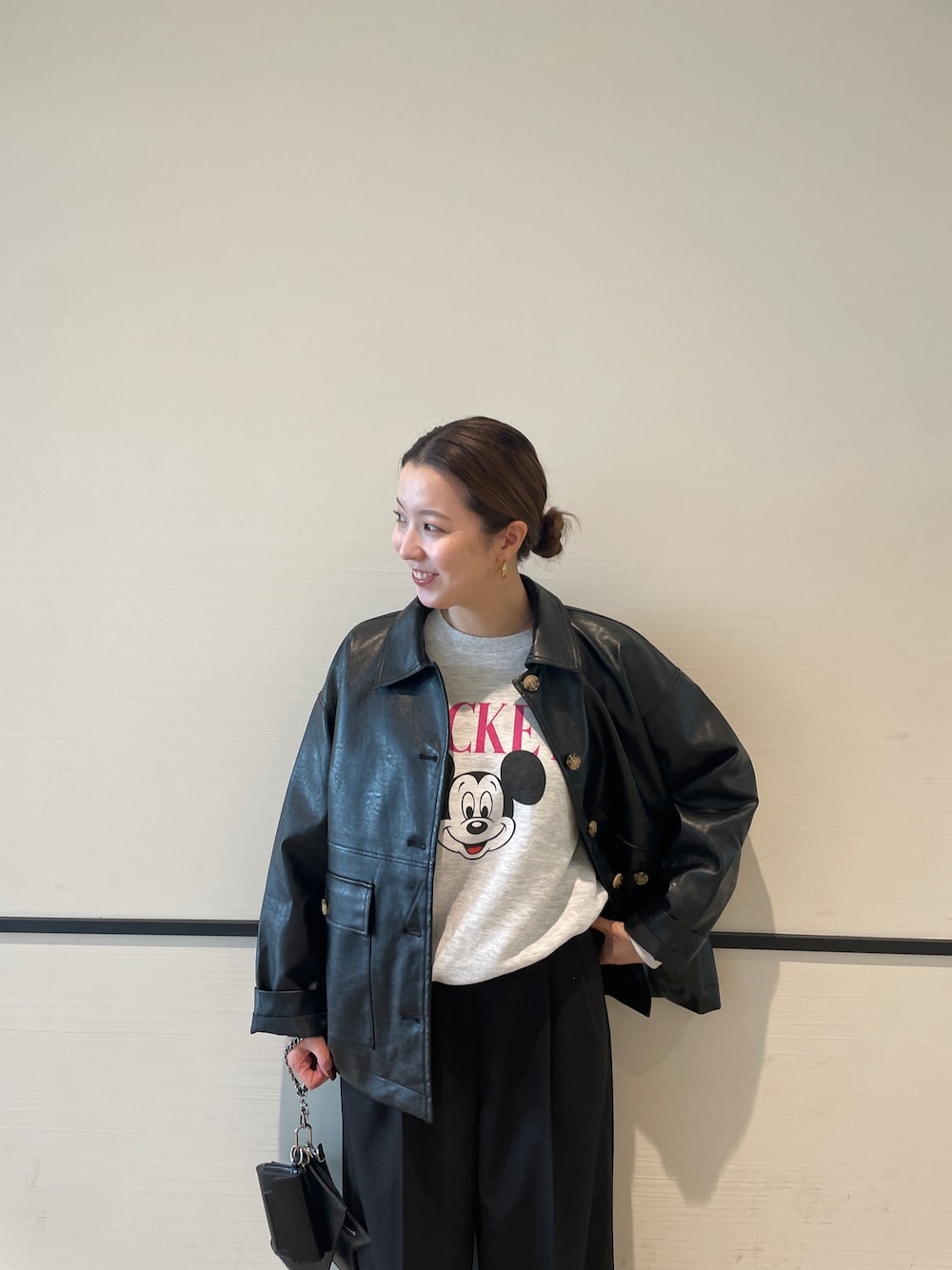 これからのディズニーコーデにぴったりな コーディネート 真ん中に大きくプリントされたミッキーが可愛い上に、裏起毛で暖かい嬉しいポイント付き✨ ミッキーを引き立たせるために、他はブラックで合わせました