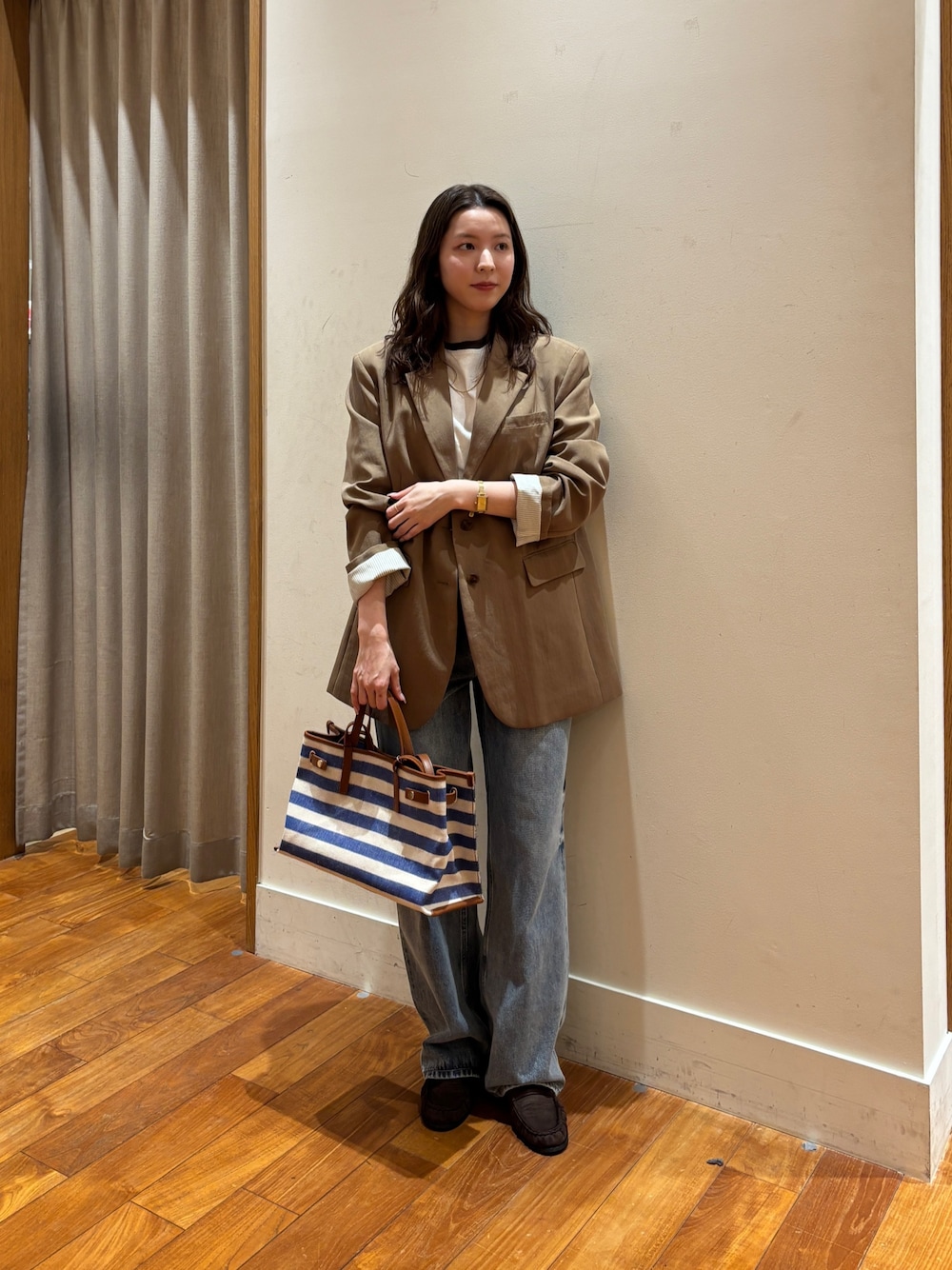 ◇ジャケット 程よくゆとりのあるオーバーシルエットで、さっと羽織るだけでトレンド感のでるアイテムです 袖はストライプの裏地が付いていて、折り返して着用するのもおすすめです◎ きれいめにもカジュアルにも合わせやすく、幅広いスタイリングにお使いいただけます! ◇トップス ほんのり透け感のあるシアー素材のラグランロンT 落ち着いた配色で大人でも着やすいデザインになっています◎ ジャケットのインナーなどにも使いやすい重宝する1枚です! ◇ボトムス ヴィンテージ感のある一本 ワイドシルエットですが、裾に向かってすっきりとしたラインになっているので、バランスの取りやすいシルエットになっています◎ 後ろポケットには遊び心のあるスタッズのハートモチーフも施されています