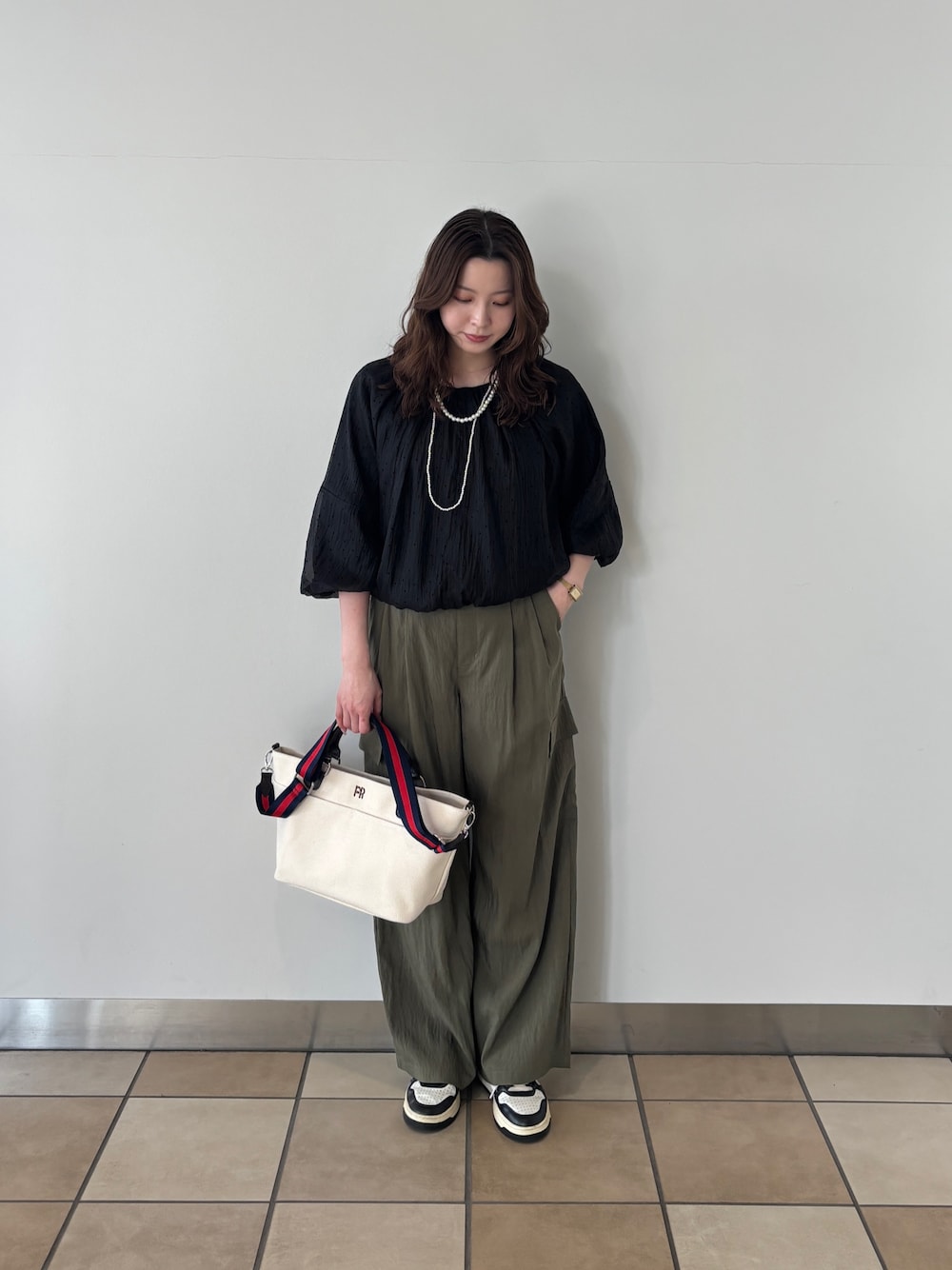 ◇トップス ふんわりとしたバルーンシルエットが目を惹くギャザーブラウス ふんわりとした立体感が女性らしく、コーディネートに華やかさをプラスしてくれます◎ デニムやカーゴパンツなどカジュアルなスタイルはもちろん、キレイめにもお使いいただけます! ◇ボトムス タックが立体感のあるシルエットを演出してくれるカーゴパンツ 程よくワイドなストレートシルエットで、すっきりとした印象になります! ウエスト後ろはゴム仕様で、リラックス感のある履き心地がポイントです◎ デイリーからきれいめカジュアルまで幅広くお使いいただけます