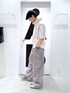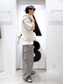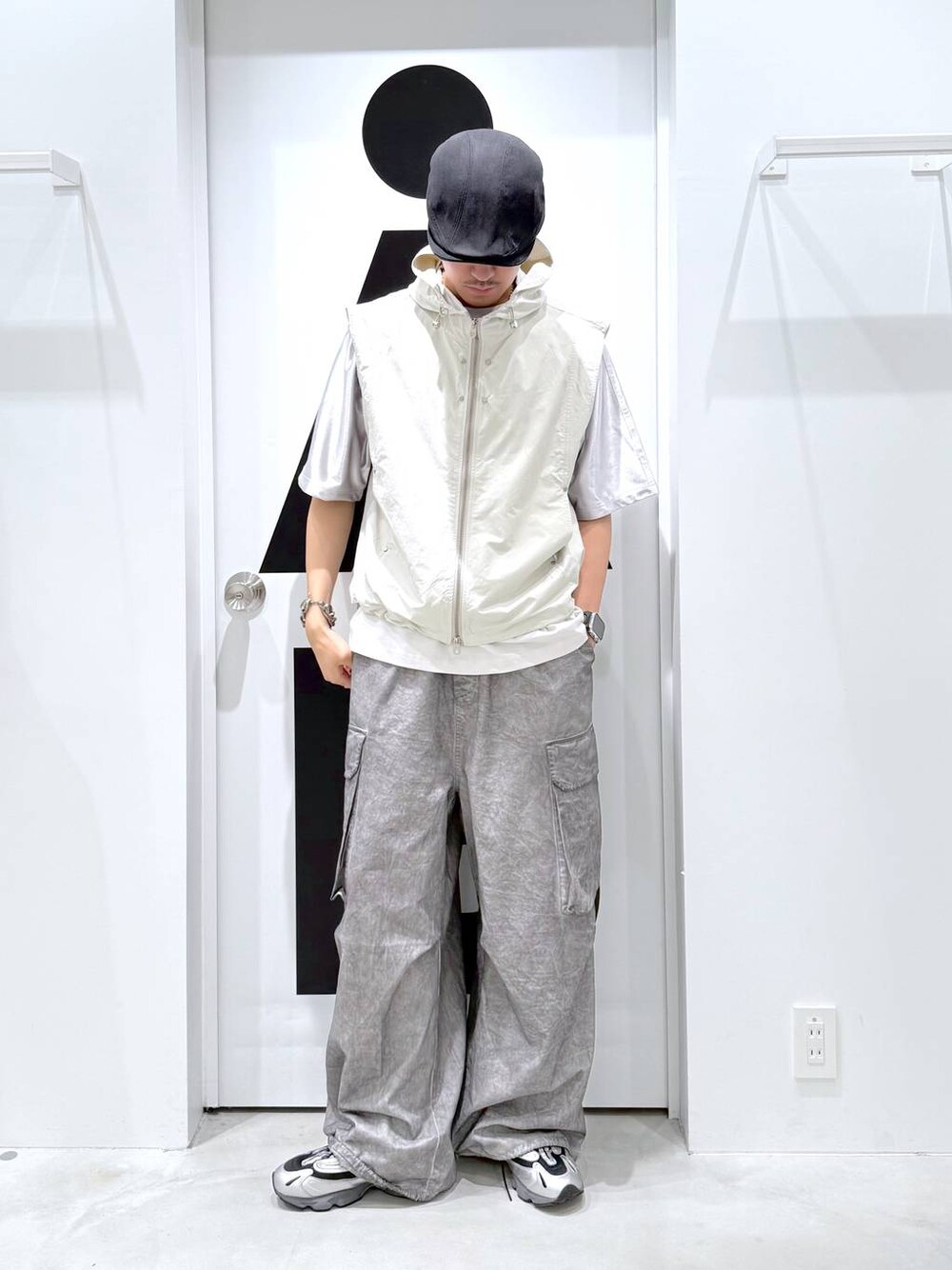👕おすすめポイント  ̄ ̄ ̄ ̄ ̄ ̄ ̄ ̄ ̄ ̄ ̄ ̄ ̄ ̄ ̄ ̄ ̄ トーンをホワイトグレーに寄せたコーディネート ベストは首元まで閉めるとハイネックで立ち上がるシルエットに。 胸元のスタッズも程よくy2kの雰囲気を醸し出してくれます。 前開けで着用した時と表情かなり変わるのでその日の気分で。 ボトムスはルーズなシルエットが特徴的なカーゴパンツ。 ヴィンテージウォッシュ加工が施されているので、長年履き込んだような風合いが楽しめます。 ヴィンテージデニムがトレンドの今、カーゴパンツでもヴィンテージの雰囲気を纏う事ができるので非常におすすめ。 このコーディネートだとインナーに使ってますが、ユニフォームTも生地の切り替えが特徴的で1枚でサマになる。 レイヤードで使っても袖の部分が特徴的な生地になっているので、よりアクセントになって◎