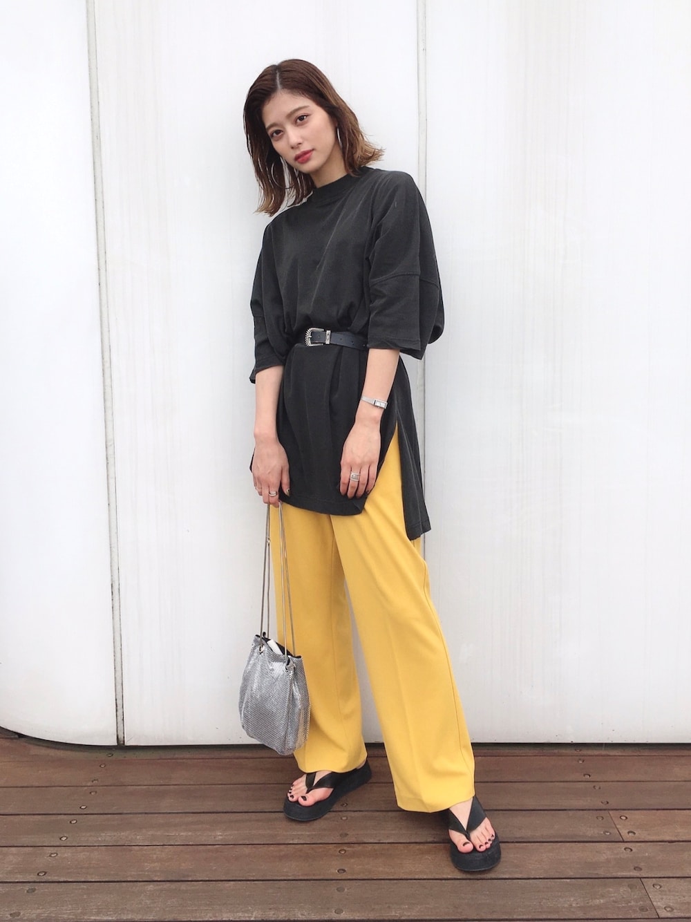 流行りのカラーパンツコーデ❤︎ 大きめTシャツはウエストマークすると スタイルアップしますよ☺︎