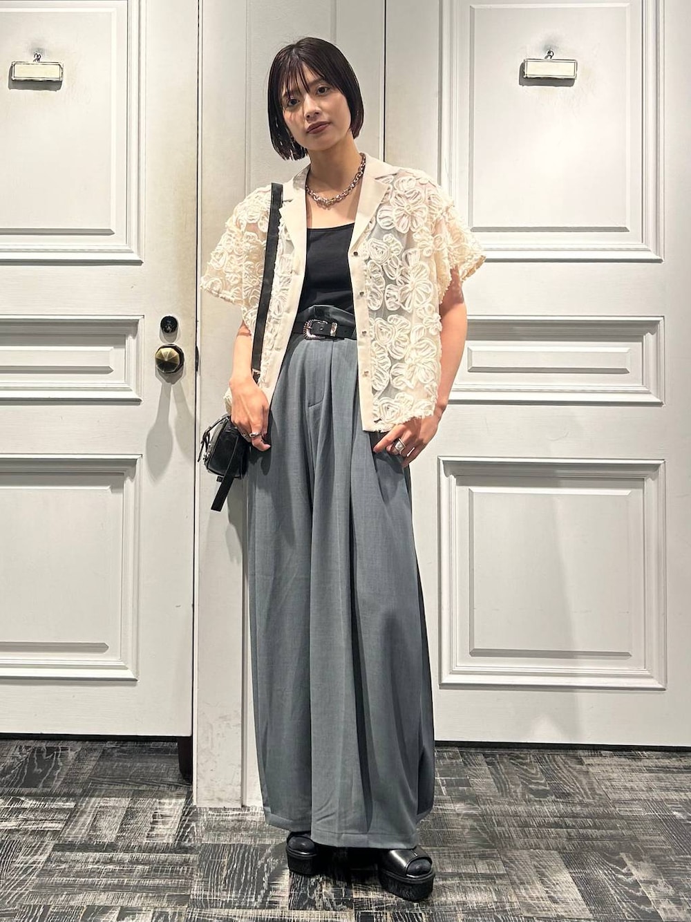 落ち着いた色合わせの大人コーデ! レースのシャツはコーデに軽やかさと女性らしさをプラスしてくれます!透け感も夏らしくておすすめです☀️ ワイドパンツは脚長効果抜群! 落ち着いたトーンで全体を引き締めてくれます!