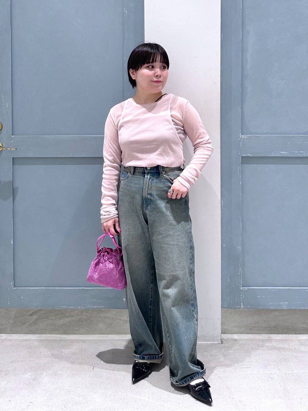 シンプルコーデは小物使いで個性を出すのが好きです◎ ふんわりと柔らかい肌触りなのでキャミソールの上からきても着心地抜群です◎ セットで今年らしくおしゃれなレイヤードスタイルが完成します♡ タイトなシルエットですが、お袖が長めになっているので体のラインを主張しすぎないのもポイントです! デニムは149cmのMサイズでわざとゆるめに履いてます! 裾を2回ほど折り返せばぺったんこシューズとも合わせられました♡