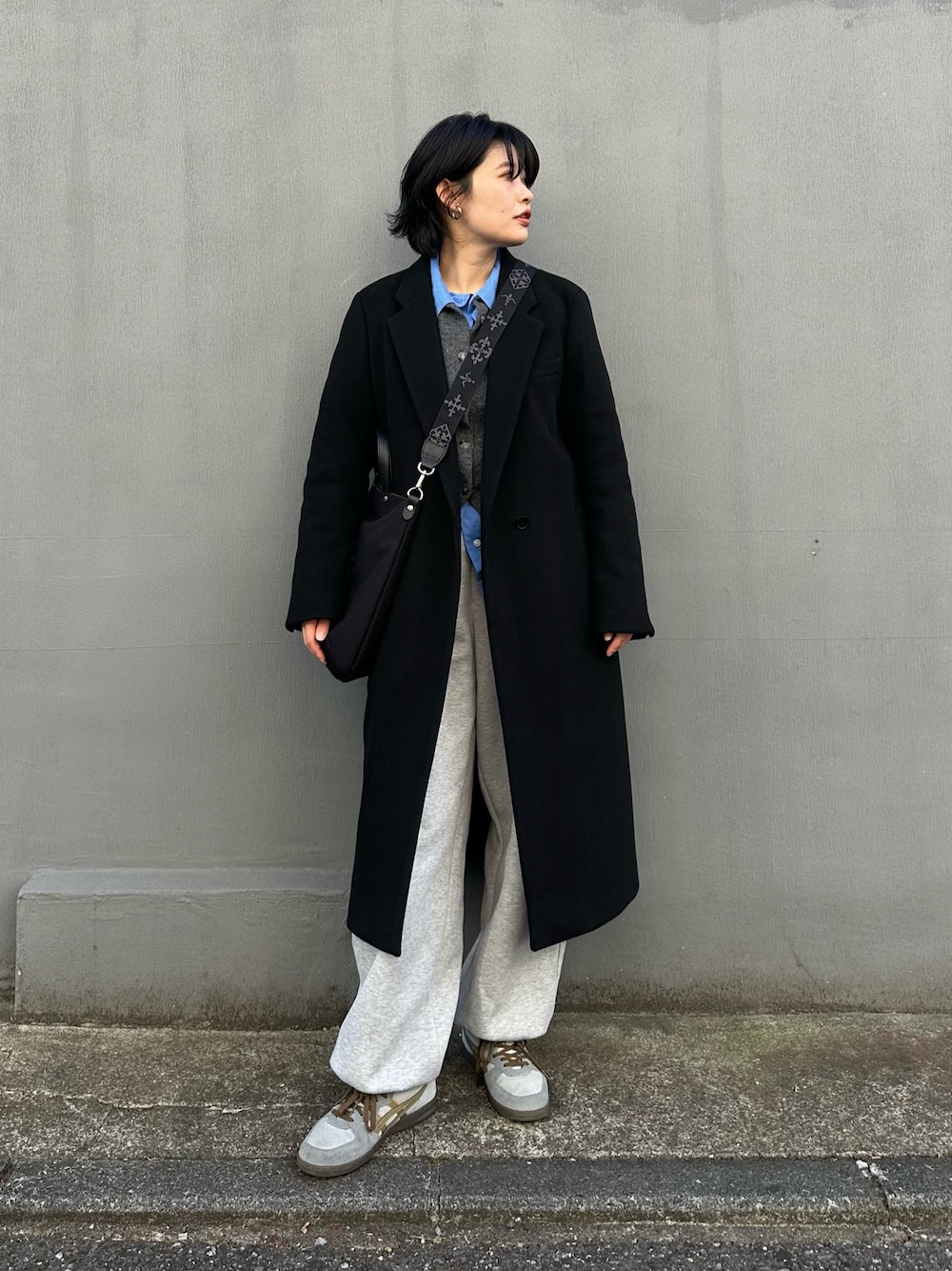 ブラック系のトートバッグを着用したレディースの冬コーディネートの1枚目の写真