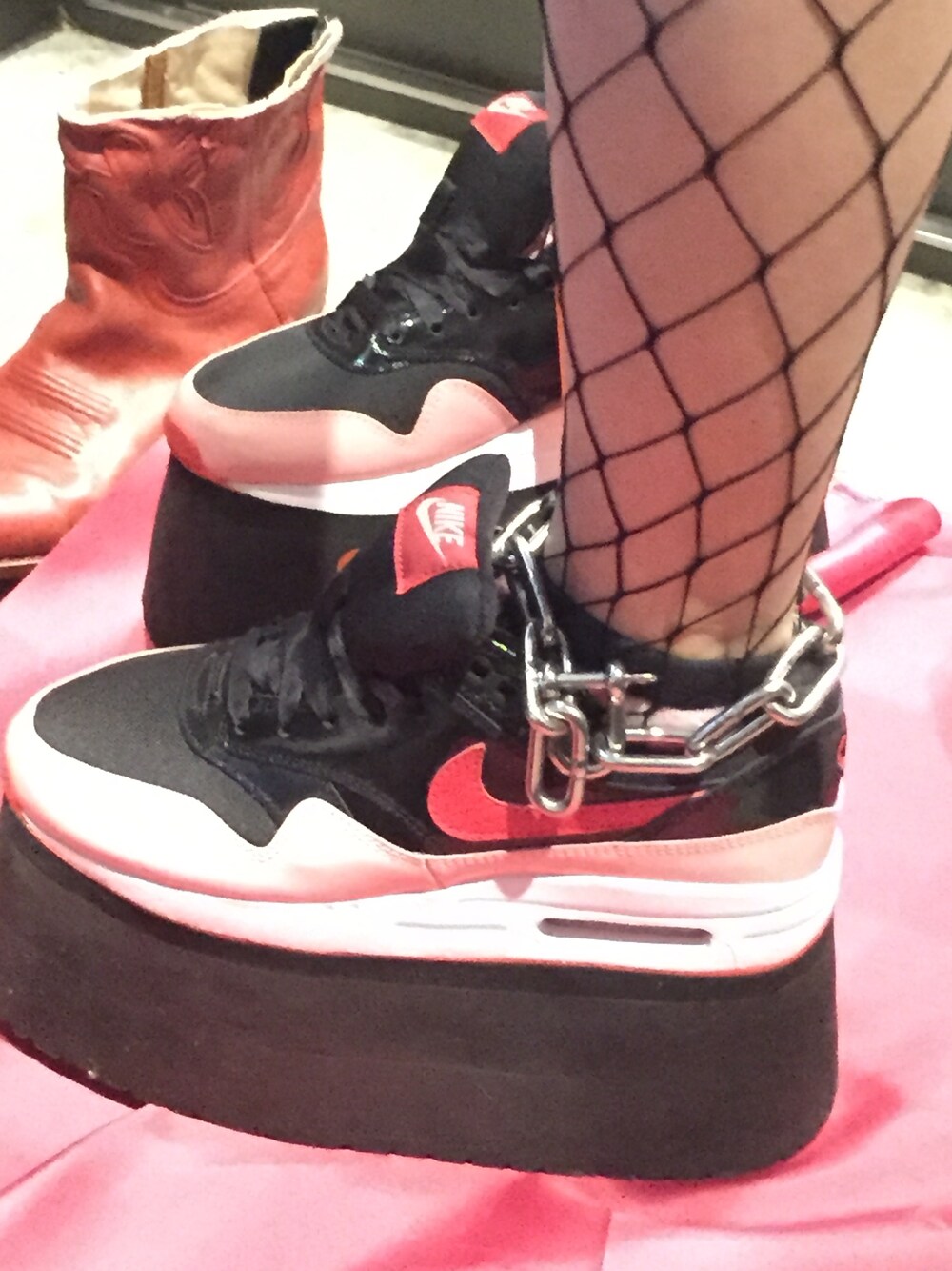 網タイツと超厚底リメイクエアマックスとインダストリアルなチェーンのオリジナリティのあるアンクレットのアウトフィットです。 当たり前だけど1点のみ。