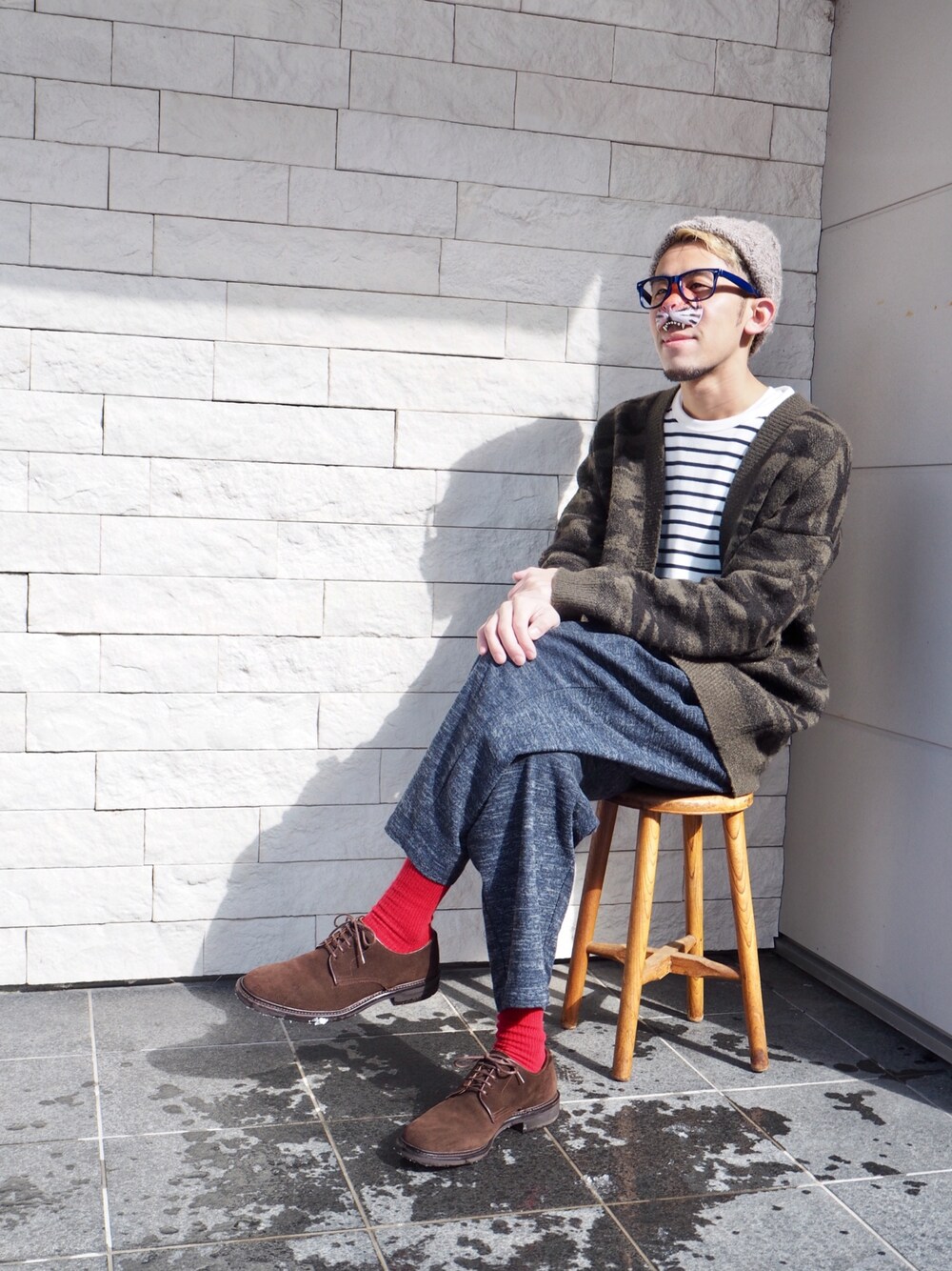 パンツはCreemaに出店中の作家さんのもの。 ゆるーく履ける裾絞りのワイドパンツ。 存在感あるパンツなので、上はシンプルに。 アウターは黒のコートを羽織ったりします。 最近、写真が恥ずかしいので鼻メガネを。 これかけると何でもできる気がする(笑)