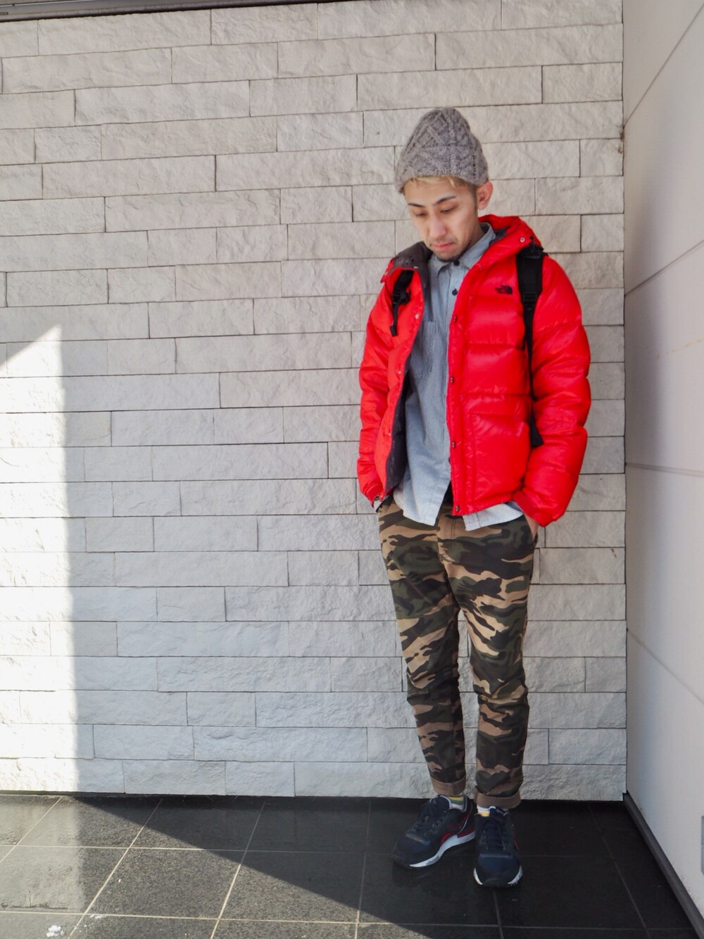 出没頻度高い迷彩パンツコーデ。 赤のノースフェイスはCAMP Sierraのショート丈のものです。 ショート丈のダウンをずっと探してたので運良く見つけました。
