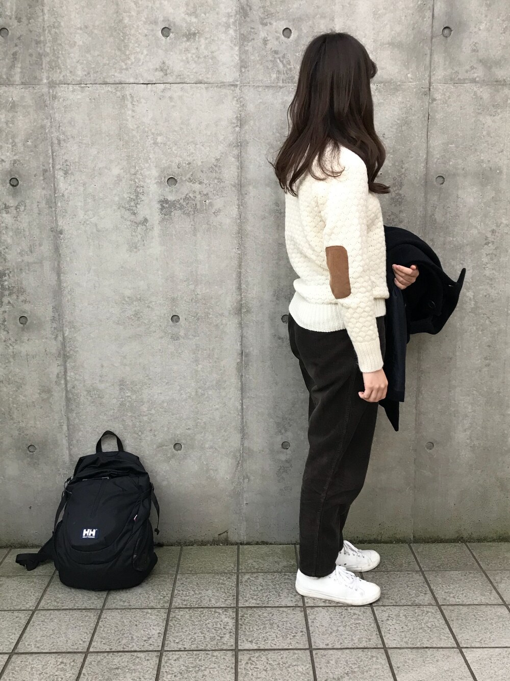rinrinのニット/セーター「BEAMS BOY / 3ゲージ ラーベン エルボーパッチ クルーネックニット」を使ったコーディネート