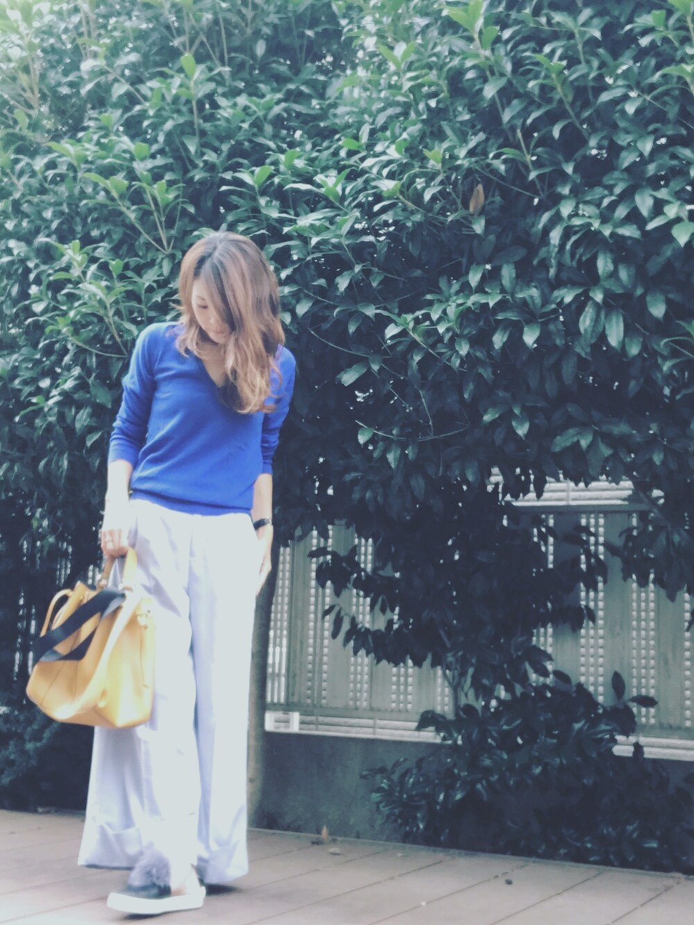 訪問ありがとうございます。 こんなブルーが好きです。 バッグは白や黒ではなく、マスタードを持ってくることで、きちんと感を外してみました。