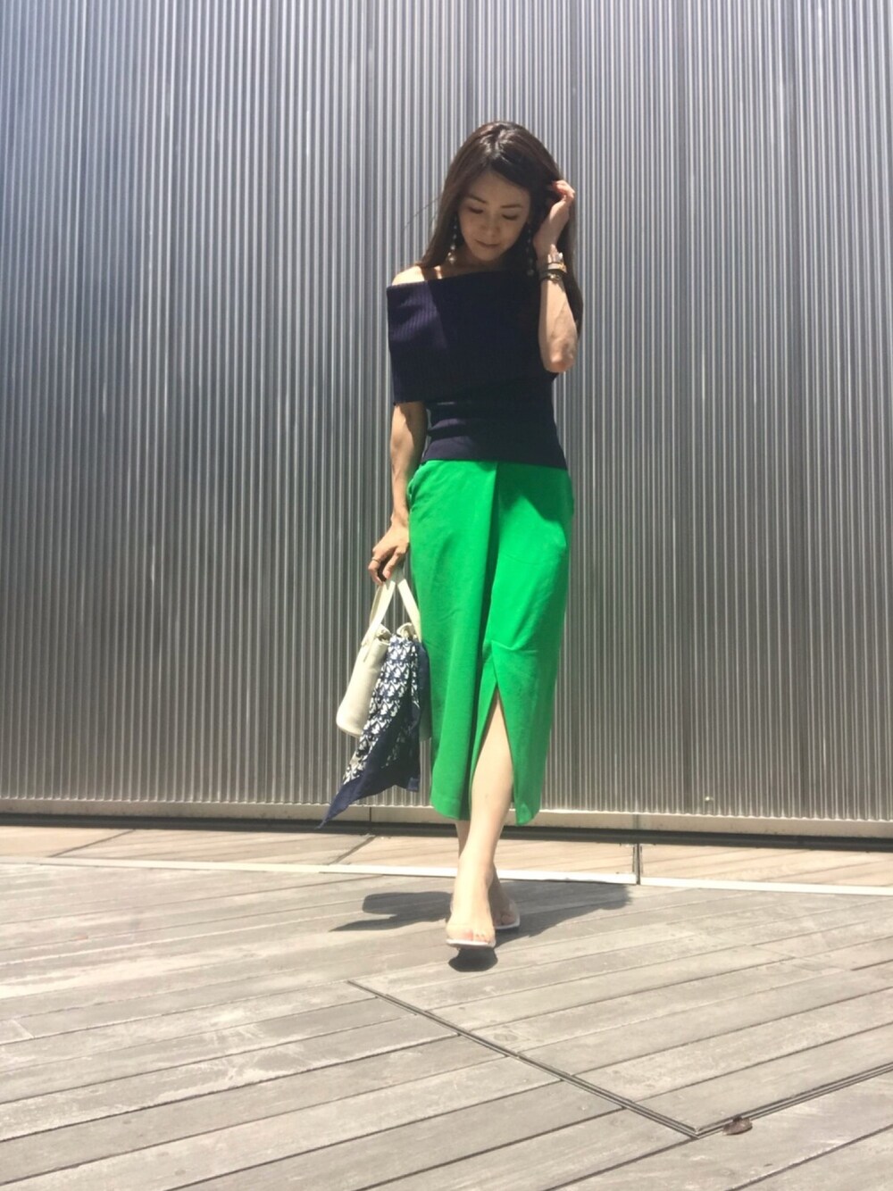 パキッと鮮やかなグリーンのタイトスカートには、 ネイビーのオフショルニットでオトナ女子らしく落ち着かせて。 . 爽やかイメージのホワイトバッグには、ちょっと柄物のスカーフをONして、アクセントを。 . . 足元は#pvc 素材で、一気に今期らしく。