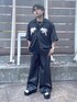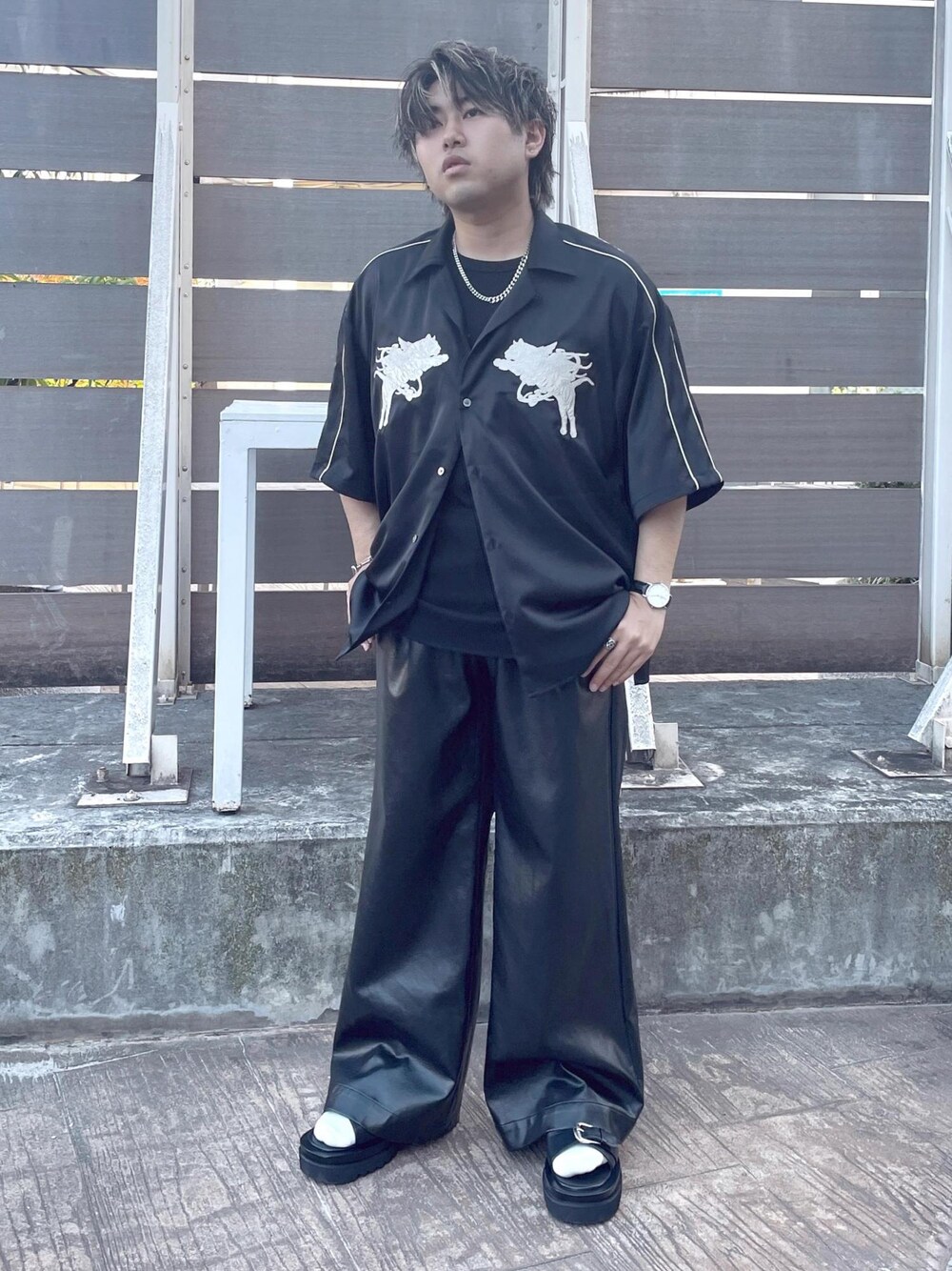 ・デザインがかっこいいスカシャツとヴィンテージレザーパンツでオールブラックストリートスタイルコーデを組みました! ・スカシャツはとろみがあり胸の刺繍がとてもかっこいいです。渋みが強いヴィンテージレザーパンツとの相性が抜群です。