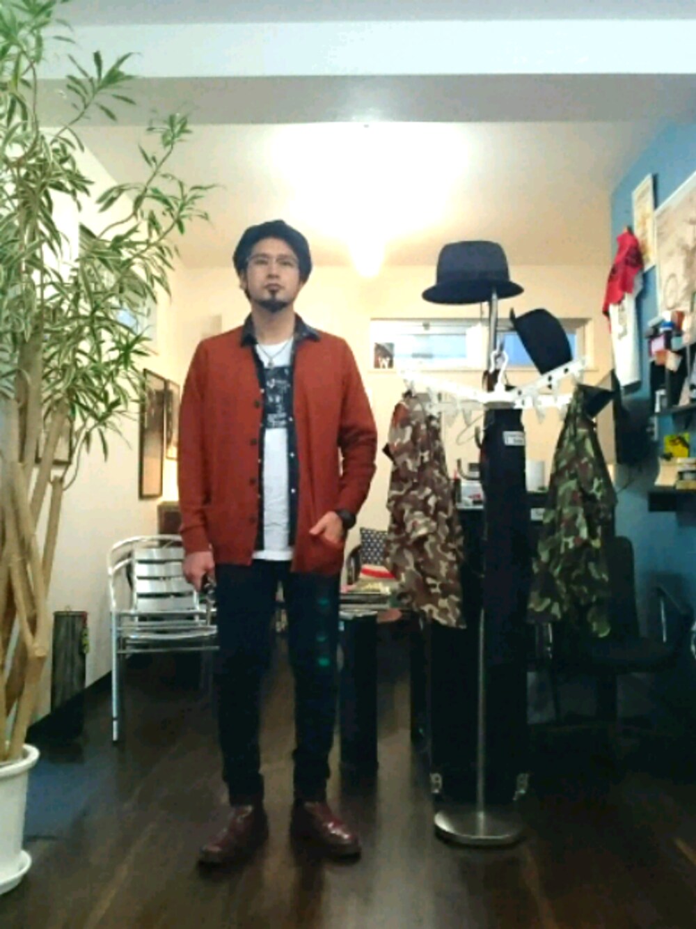 新年会の時🍺 ユニクロのカーディガンXL sizeがルードデニムシャツに 意外に合うなと🔥マーチンの チェリーレッドにも合うなと🎵 (笑)